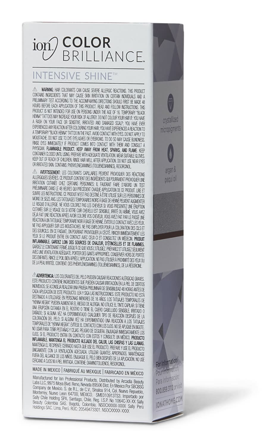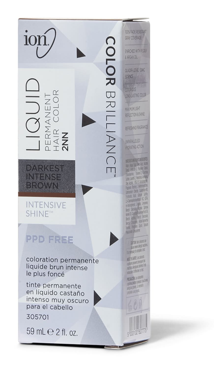 The line professional stylists have trusted for years. ion Color Brilliance Permanent Hair Color makes it easy to get extraordinary, long-lasting, salon quality results at home. The luxurious Italian formulas are made to be especially gentle and protect against damage. The Color Brilliance Permanent Liquid Hair Color pallet consists of luxurious shades with advanced ionic technology that utilizes pure ionic micro pigments for deeper, more intense color deposit. Ionic wheat germ protein, nourishing botanical extracts, and low ammonia help ion Color Brilliance penetrate the cuticle layer of the hair and lodge in the cortex, ensuring 100% flawless gray coverage. Superior quality and proprietary blends are formulated in Italy by ion's expert team of chemists to deliver unparalleled results. The unique system combines the finest quality natural and exotic ingredients with powerful high-tech compounds to achieve exquisite, brilliant color with superior gray coverage. ion Hair Color science relies on the power of micro-pigmentation—ion's microscopic pigment molecules oxidize slower, allowing them to penetrate deep into the cortex of each hair strand for long-lasting, fade-resistant color. These formulas are PPD-free and enriched with Hyaluronic Acid, Argan Oil, Pequi Oil, and botanicals to nourish and strengthen hair from within. Not to mention, ion Hair Color is gentle on hair, containing up to 38% less ammonia than the leading professional brands on the market. Unlock your hair’s true potential with ion’s cutting-edge, salon-quality color science and bring home vibrance like never before. • Color: 2nn darkest intense brown • Size: 2