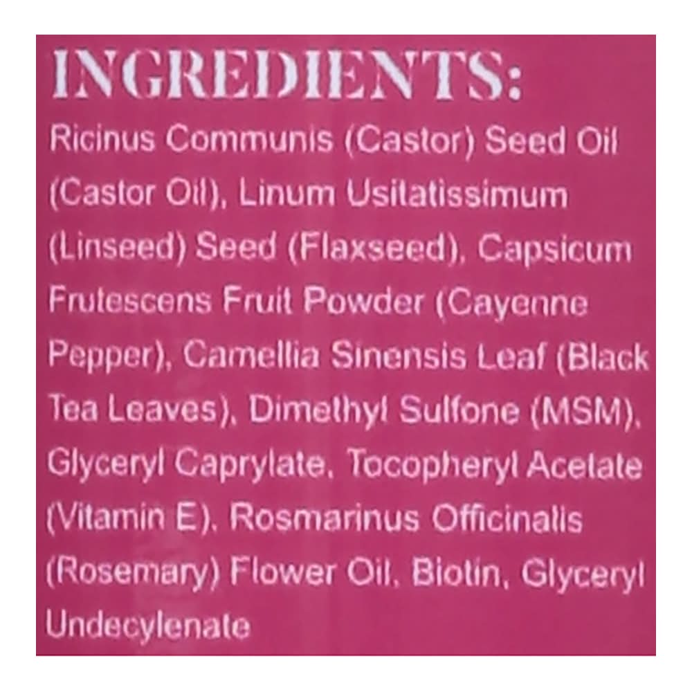 Ingredients: Ricinus Communis (Castor) Seed Oil (Castor Oil), Linum Usitatissimum (Linseed) Seed (Flaxseed), Capsicum Frutescens Fruit Powder (Cayenne Pepper), Camellia Sinensis Leaf (Black Tea Leaves), Dimethyl Sulfone (MSM), Glyceryl Caprylate, Tocopheryl Acetate (Vitamin E), Rosmarinus Officinalis (Rosemary) Flower Oil, Biotin, Glyceryl Undecylenate