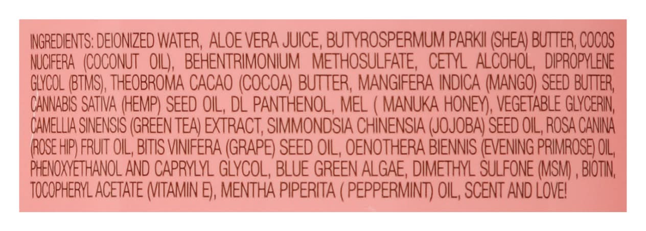 Ingredients: Deionized Water, Aloe Vera Juice, Butyrospermum Parkii (Shea) Butter, Cocos Nucifera (Coconut Oil), Behentrimonium Methosulfate, Cetyl Alcohol, Dipropylene Glycol (BTMS), Theobroma Cacao (Cocoa) Butter, Mangifera Indica (Mango) Seed Butter, Cannabis Sativa (Hemp) Seed Oil, DL Panthenol, Mel ( Manuka Honey), Vegetable Glycerin, Camellia Sinensis (Green Tea) Extract, Simmondsia Chinensia (Jojoba) Seed Oil, Rosa Canina (Rose Hip) Fruit Oil, Bitis Vinifera (Grape) Seed Oil, Oenothera Biennis (Evening Primrose) Oil, Phenoxyethanol and Caprylyl Glycol, Blue Green Algae, Dimethyl Sulfone (MSM), Biotin, Tocopheryl Acetate (Vitamin E), Mentha Piperita (Peppermint) Oil, Scent and Love! Contains: Tree Nuts, Coconuts, Tree Nuts, Sheanuts
