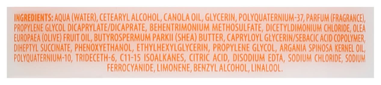 Ingredients: Aqua (Water), Cetearyl Alcohol, Canola Oil, Glycerin, Polyquaternium-37, Parfum (Fragrance), Propylene Glycol, Dicaprylate/Dicaprate, Behentrimonium Methosulfate, Dicetyldimonium Chloride, Olea Europaea (Olive) Fruit Oil, Butyrospermum Parka (Shea) Butter, Capryloyl Glycerin/Sebacic Acid Copolymer, Diheptyl Succinate, Phenoxyethanol, Ethylhexylglycerin, Propylene Glycol, Argania Spinosa Kernel Oil, Polyquaternium-10, Trideceth-6, C11-I5 Isoalkanes, Citric Acid, Disodium EDTA, Sodium Chloride, Sodium Ferrocyanide, Limonene, Benzyl Alcohol, Linalool Contains: Tree Nuts, Sheanuts, Tree Nuts, Argan Nuts