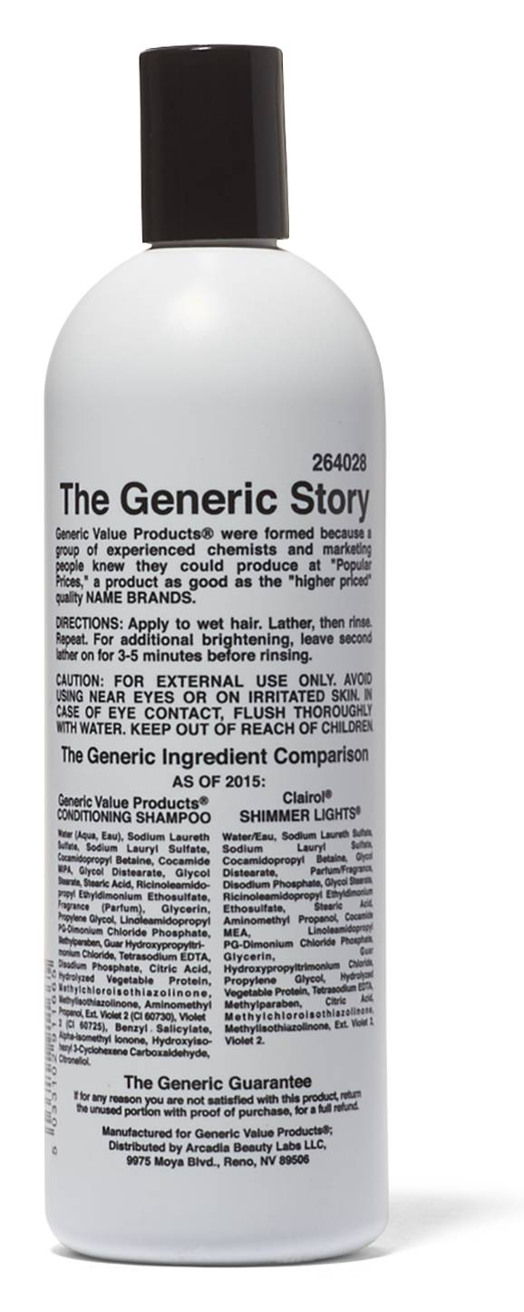 It is a protein-enriched conditioning formula that tones down brassiness in blonde and gray hair. It also refreshes faded highlights and adds vibrancy to dulling hair. Hair is left vibrant and shiny without an oily feel or heavy residue. Compare to Clairol Shimmer Lights Original Conditioning Shampoo and save! The GVP (Generic Value Products) brand was formed because a group of experienced beauty professionals knew they could produce (at “Popular Prices”) a product as good as the higher priced name brands. Size: 16