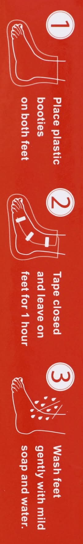 After cleansing your feet, put the plastic booties on both feet and secure the booties around each ankle using the enclosed pieces of adhesive tape. (note: we recommend to place a pair of socks over the plastic booties and remain seated.) wear the plastic booties for one hour to allow product to absorb. (note: to enhance the effects of baby foot, we recommend soaking your feet prior to the treatment.) after one hour, remove the plastic booties and wash your feet with soap and water. the dead skin cells will begin to peel 5-7 days after the initial application. the dead skin cells could continue to peel naturally for up to two weeks, depending on the amount of dead skin on the feet, leaving your feet soft and smooth, just like a baby's foot. recommended usage is every 2-3 months. if you feel reapplication is necessary, wait two weeks before using again. each pair of plastic booties are for single application use.