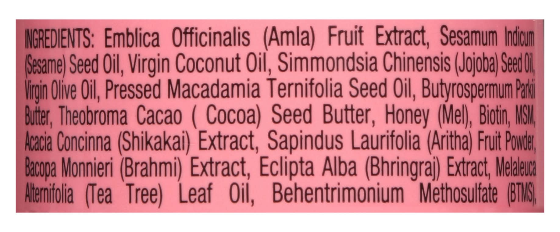 Ingredients: Emblica Officinalis (Amla) Fruit Extract, Sesamum Indicum (Sesame) Seed Oil, Virgin Coconut Oil, Simmondsia Chinensis (Jojoba) Seed Oil, Virgin Olive Oil, Pressed Macadamia Ternifolia Seed Oil, Butyrospermum Parkii Butter, Theobroma Cacao ( Cocoa) Seed Butter, Honey (Mel), Biotin, MSM, Acacia Concinna (Shikakai) Extract, Sapindus Laurifolia (Aritha) Fruit Powder, Bacopa Monnieri (Brahmi) Extract, Eclipta Alba (Bhringraj) Extract, Melaleuca Alternifolia (Tea Tree) Leaf Oil, Behentrimonium Methosulfate (BTMS), Phthalate Free Fragrance, And Love! Contains: Sesame, Tree Nuts, Coconuts, Tree Nuts, Macadamia Nuts