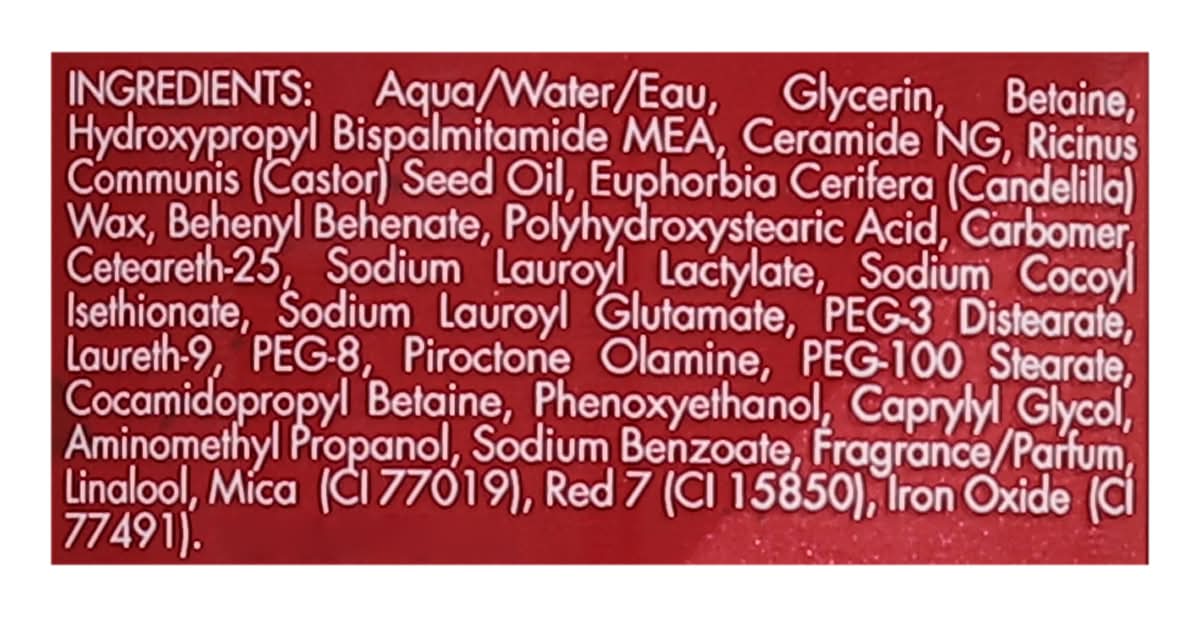 Ingredients: Aqua/Water/Eau, Glycerin, Betaine, Hydroxypropyl Bispalmitamide MEA, Ceramide NG, Ricinus Communis (Castor) Seed Oil, Euphorbia Cerifera (Candelilla) Wax, Behenyl Behenate, Polyhydroxystearic Acid, Carbomer, Ceteareth-25, Sodium Lauroyl Lactylate, Sodium Cocoyl Isethionate, Sodium Lauroyl Glutamate, PEG-3 Distearate, Laureth-9, PEG-8, Piroctone Olamine, PEG-100 Stearate, Cocamidopropyl Betaine, Phenoxyethanol, Caprylyl Glycol, Aminomethyl Propanol, Sodium Benzoate, Fragrance/Parfum, Linalool, Mica (CI 77019), Red 7 (CI 15850), Iron Oxide (CI 77491)