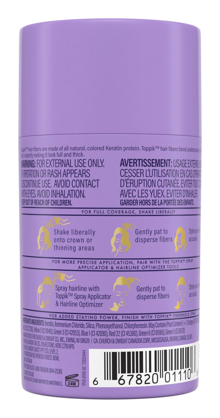 Sprinkle the product onto thinning areas and style as desired. for best results, use a hair spray to set the fibers in place.