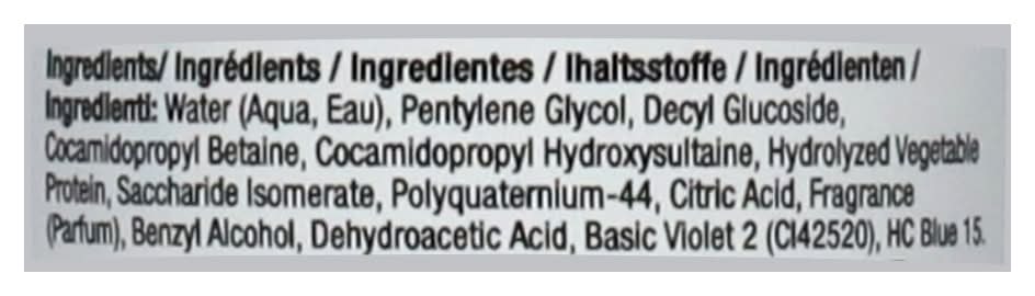 Ingredients: Water (Aqua, Eau), Pentylene Glycol, Decyl Glucoside, Cocamidopropyl Betaine, Cocamidopropyl Hydroxysultaine, Hydrolyzed Vegetable Protein, Saccharide Isomerate, Polyquaternium-44, Citric Acid, Fragrance (Parfum), Benzyl Alcohol, Dehydroacetic Acid, Basic Violet 2 (Ci42520), Hc Blue 15