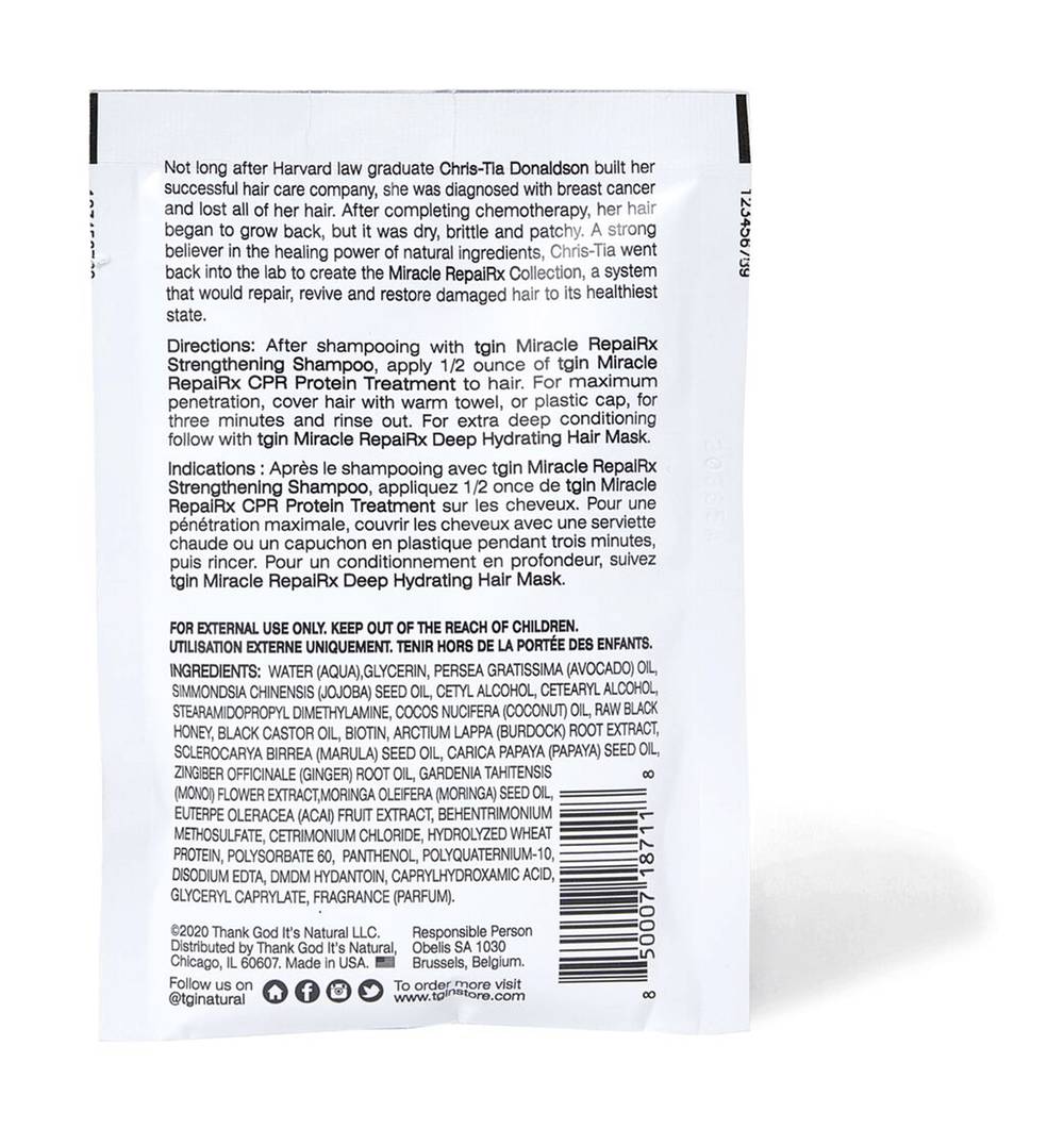 Miracle RepaiRx Curl Protein Reconstructor works deep to detoxify hair, remove buildup and strengthen strands by restoring protein in the hair. This gentle formula moisturizes the scalp, and smooths the hair cuticle. Promotes hair growth and a healthy scalp. Free from parabens, petrolatum, lanolin, artificial colors, or animal testing.