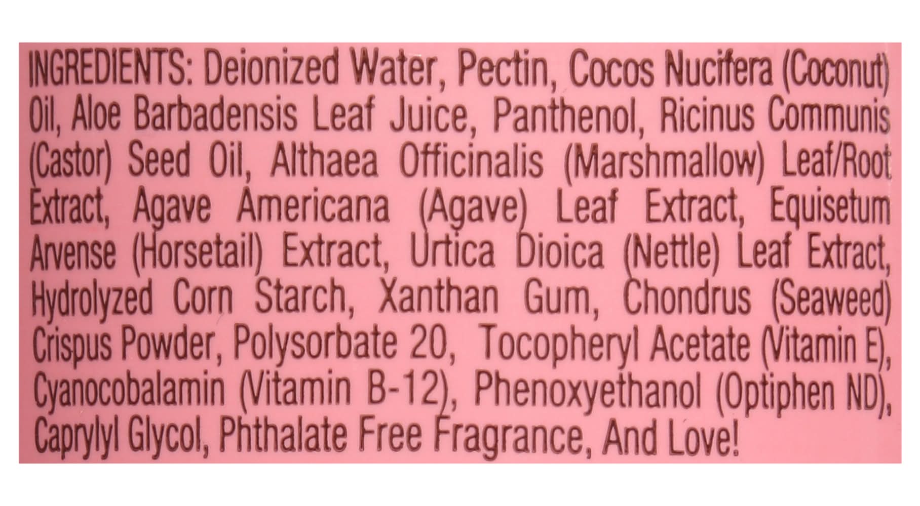 Ingredients: Dionized Water, Pectin, Coco Nucifera (Coconut) Oil, Aloe Barbadensis Leaf Juice, Panthenol, Ricinus Communis (Castor) Seed Oil, Althaea Officinalis (Marshmallow) Leaf/Root Extract, Agave American (Agave) Leaf Extract, Equisetum Arvense (Horsetail) Extract, Uritca Dioica (Nettle) Leaf Extract, Hydrolyzed Corn Starch, Xanthan Gum, Chondrus (Seaweed) Crispus, Polysorbate 20, Tocopheryl Acetate (Vitamin E), Cyanocobalamin (Vitamin B-12), Phenoxyethanol (Optiphen Nd) Caprylyl Glycol, Phthalate Free Fragrance (Parfum), and Love! Contains: Tree Nuts, Coconuts, Corn