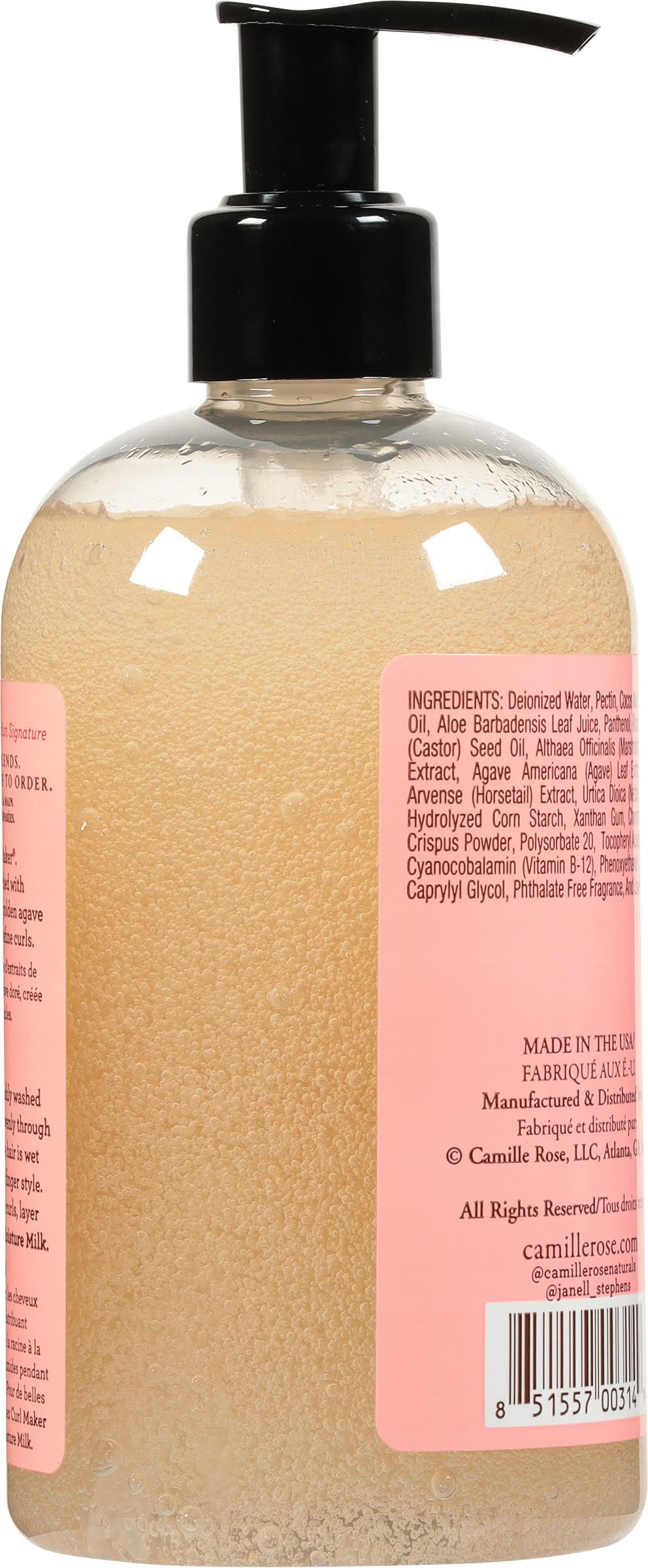 Camille Rose Naturals Curl Maker contains sweet extracts of marshmallow and agave melted into a gourmet oil base of coconut and marshmallow, then layered with botanical juices of seaweed and aloe. Finish with an enriching infusion of vitamins E and B-12 for optimal hair nourishment.