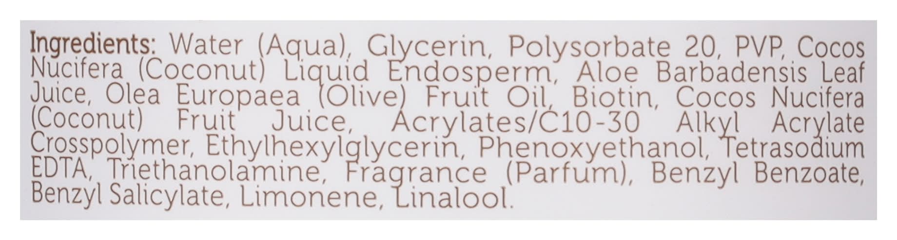 Ingredients: Water (Aqua), Glycerin, Polysorbate 20, PVP, Cocos Nucifera (Coconut) Liquid Endosperm, Aloe Barbadensis Leaf Juice, Olea Europea (Olive) Fruit Oil, Biotin, Cocos Nucifera (Coconut) Fruit Juice, Acrylates/C10-30 Alkyl Acrylate Crosspolymer, Ethylhexylglycerin, Phenoxyethanol, Tetrasodium EDTA, Triethanolamine, Fragrance (Parfum), Benzyl Benzoate, Benzyl Salicylate, Limonene, Linalool Contains: Tree Nuts, Coconuts
