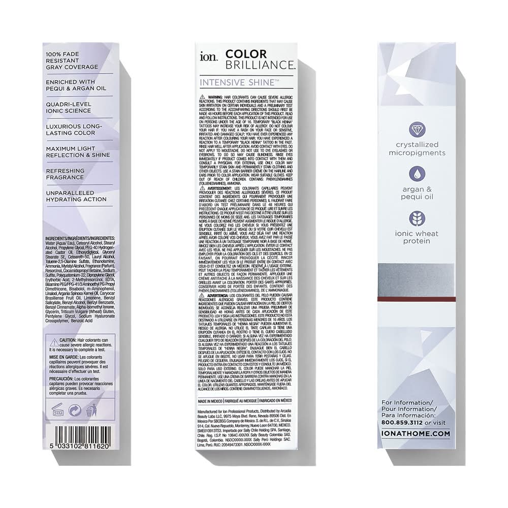 ion Color Brilliance Permanent Creme Hair Color has a palette of luxurious shades. The advanced ionic technology utilizes pure ionic micro pigments for deeper, more intense color deposit. ion Color Brilliance penetrates the cuticle layer of the hair and lodges in the cortex, ensuring 100% flawless gray coverage. High Lift shades lift up to 5 levels and tone without bleach. ion Hair Color’s superior quality, proprietary blends are formulated in Italy by our expert team of chemists to deliver unparalleled results. ion's unique system combines the finest quality natural and exotic ingredients with powerful high-tech compounds to achieve exquisite, brilliant color with superior gray coverage. ion Hair Color science relies on the power of micro-pigmentation — ion's microscopic pigment molecules oxidize slower, allowing them to penetrate deep into the cortex of each hair strand for long-lasting, fade-resistant color. These formulas are PPD free and enriched with hyaluronic acid, argan oil, pequi oil and botanicals to nourish and strengthen hair from within. Not to mention, ion Hair Color is gentle on hair, containing up to 38% less ammonia than the leading professional brands on the market. Unlock your hair’s true potential with ion’s cutting-edge, salon-quality color science, and bring hom... • Color: 5nn light intense brown • Size: 2.05