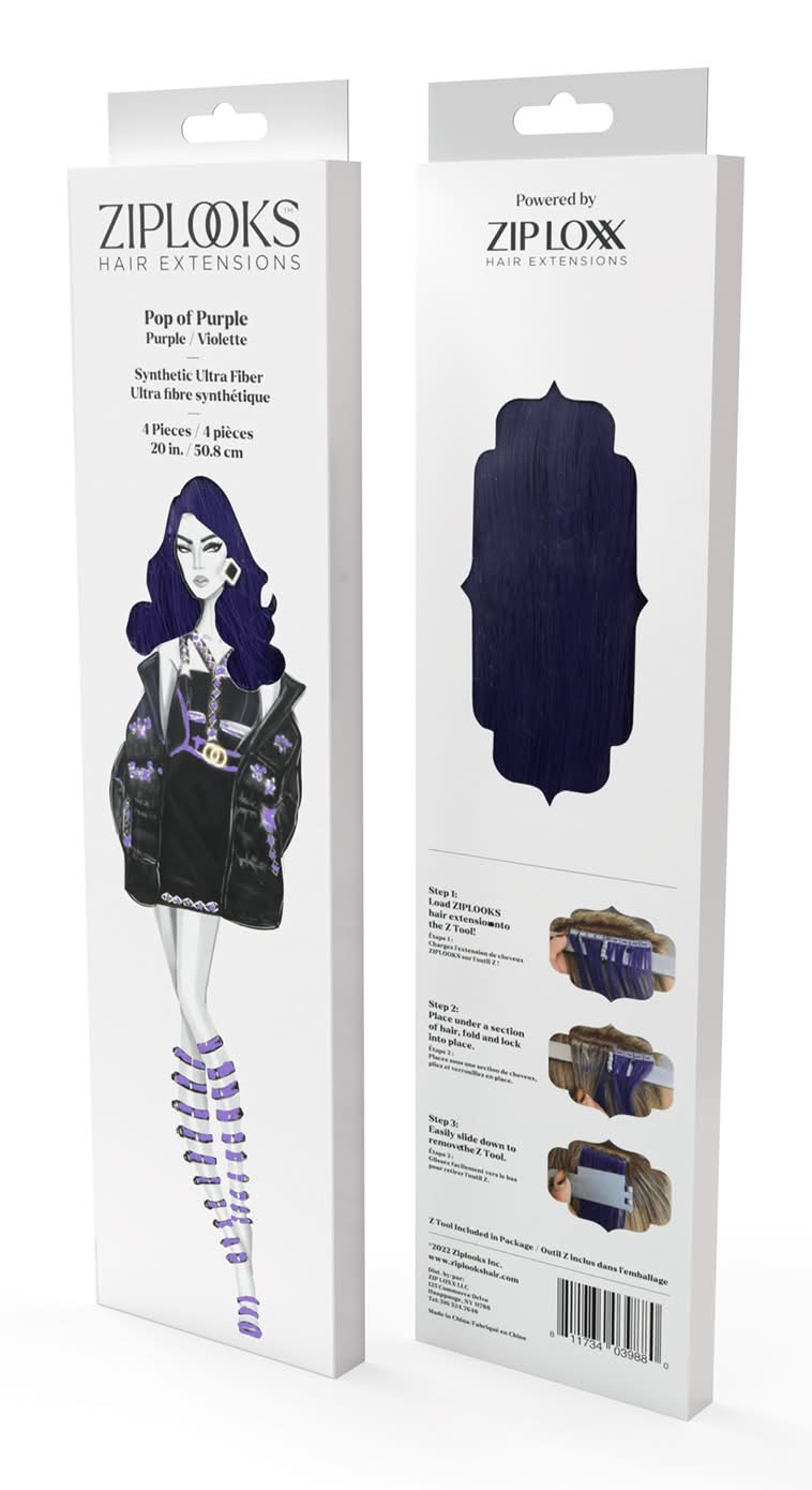 ZIPLOOKS extensions are made with 100% synthetic ultra fibers. ZIPLOOKS HAIR EXTENSIONS synthetic ultra fibers are the highest caliber of non-human synthetic hair fibers available on the market today. ZIPLOOKS ultra fibers are a superior synthetic fiber due to the way they act, curl, and blend with a client's natural hair. This product includes Z Tool for easy installation, which makes it perfect for beginners as well as professionals. It is easy to maintain these extensions just like natural hair. Our heat-resistant hair extensions can be washed and styled at a maximum temperature of 350 degrees Fahrenheit. ZIPLOOKS provides a completely new idea as to how and when extensions can be used. ZIPLOOKS not only allows you to add length & volume, but highlights or a simple pop of color as well, for as little or as long as your heart desires or your outfit matches. ZIPLOOKS ultra fibers will quickly become your favorite accessory. • Color: Pop of purple • Size: 20 in