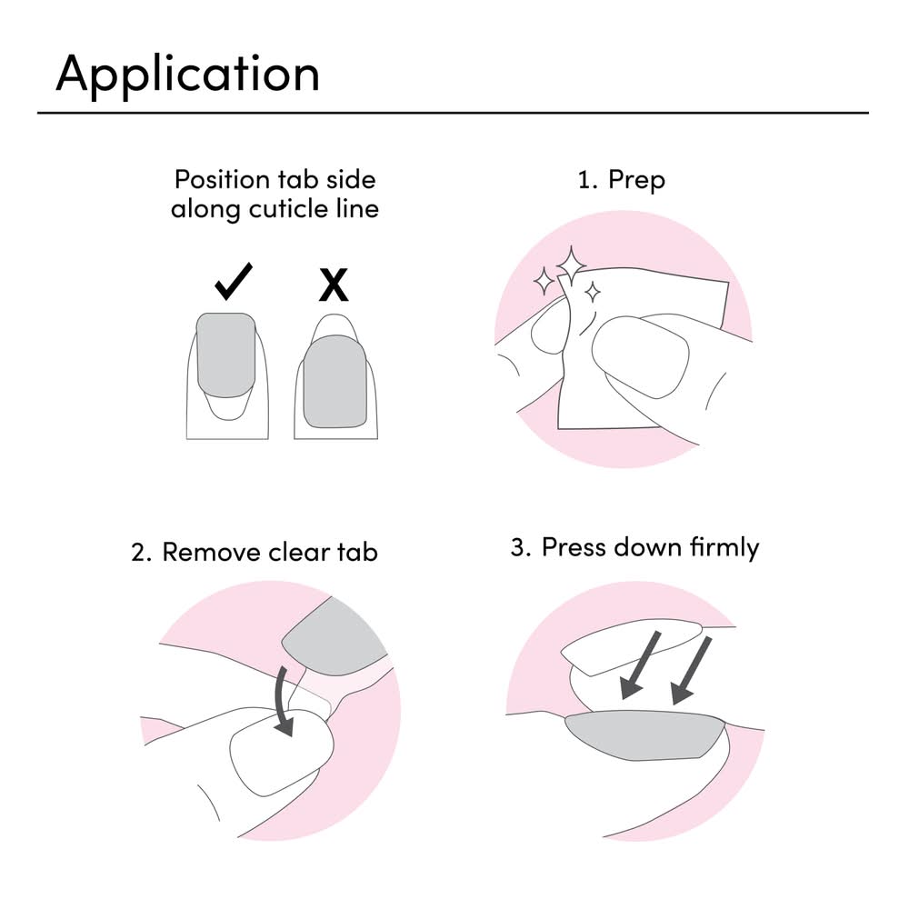 How to apply- prep: wash your hands with soap & water. trim & file free-edge of nails. push back cuticles using manicure stick. use enclosed prep pad to thoroughly clean nails of any oils or residue. make sure your nails are completely dry. application: open package and select the correct size nail for each finger using number key located on the underside of each nail. a. if you are between sizes always select the smaller nail size. peel off clear backing film to expose adhesive. align nail with cuticle, making sure to place the clear tab side at cuticle. press down firmly starting in the middle, then press down on each side, left to right. how to remove- create a gap using manicure stick to gently lift cuticle side of nail away from your natural nail apply a drop of polish remover or cuticle oil between natural nail and magic press. wait 1 minute and gently lift away the nail.