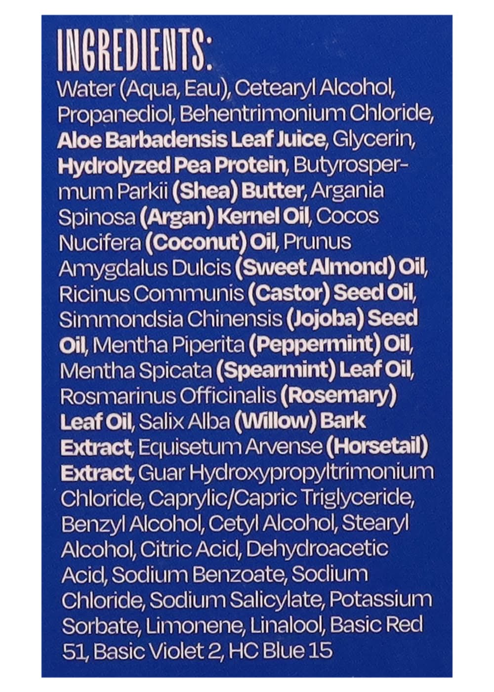 Ingredients: Water (Aqua, Eau), Cetearyl Alcohol, Propanediol, Behentrimonium Chloride, Aloe Barbadensis Leaf Juice, Glycerin, Hydrolyzed Pea Protein, Butyrospermum Parkii (Shea) Butter, Argania Spinosa (Argan) Kernel Oil, Cocos Nucifera (Coconut) Oil, Prunus Amygdalus Dulcis (Sweet Almond) Oil, Ricinus Communis (Castor) Seed Oil, Ricinus Communis (Castor) Seed Oil, Simmondsia Chinensis (Jojoba) Seed Oil, Mentha Piperita (Peppermint) Oil, Mentha Spicata (Spearmint) Leaf Oil, Rosmarinus Officinalis (Rosemary) Leaf Oil, Salix Alba (Willow) Bark Extract, Equisetum Arvense (Horsetail) Extract, Guar Hydroxypropyltrimonium Chloride, Caprylic/Capric Triglyceride, Benzyl Alcohol, Cetyl Alcohol, Stearyl Alcohol, Citric Acid, Dehydroacetic Acid, Sodium Benzoate, Sodium Chloride, Sodium Salicylate, Potassium Sorbate, Limonene, Linalool, Basic Red 51, Basic Violet 2, HC Blue 15 Contains: Tree Nuts, Sheanuts, Tree Nuts, Argan Nuts, Tree Nuts, Almonds, Tree Nuts, Coconuts