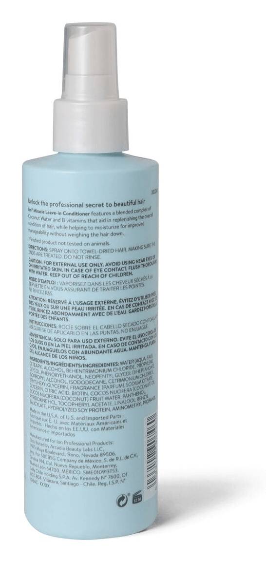 ion Miracle Leave-in Conditioner is great for all types of hair with normal or dry, curly or straight, damaged or healthy, and even chemically or color-treated hair. This leave-in conditioner hydrates and detangles while it eliminates frizz and increases manageability. Helps to prevent split ends and stops breakage while protecting protects from heat and environmental damage. ion Miracle Leave-in Conditioner is 100% Vegan and is paraben free.