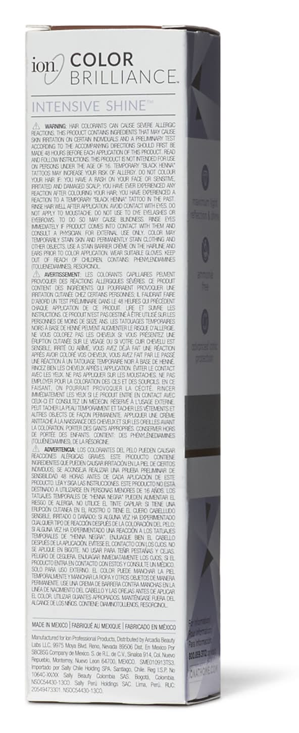 Creme Hair Color is a state-of-the-art European Ionic Formula that is a luxurious, long-lasting, deposit-only hair color without ammonia. This hair color covers and blends gray hair up to 100% without lifting the hair's natural pigment. This hair color formula will allow same-day color with chemical relaxers and permanent waves. Hair Color’s superior quality, proprietary blends are formulated in Italy by our expert team of chemists to deliver unparalleled results. Our unique system combines the finest quality natural and exotic ingredients with powerful high-tech compounds to achieve exquisite, brilliant color with superior gray coverage. Ion Hair Color science relies on the power of micro-pigmentation—our microscopic pigment molecules oxidize slower, allowing them to penetrate deep into the cortex of each hair strand for long-lasting, fade-resistant color. ion's formulas are PPD-free and enriched with Hyaluronic Acid, Argan Oil, Oil, and botanicals to nourish and strengthen hair from within. Not to mention, ion Hair Color is gentle on hair, containing up to 38% less ammonia than the leading professional brands on the market. Unlock your hair’s true potential with Ion’s cutting-edge, salon-quality color science and bring home vibrancy like never before. The Ionic formula provides protection for stronger hair structure. botanically derived nourishing ingredients with a refreshing fragrance. Thirty-two Shades plus Clear/00. "Ion Color Brilliance hair color provides rich, luxurious color and even ensures 100% flawless gray coverage." • Color: 5g light golden brown • Size: 2.05