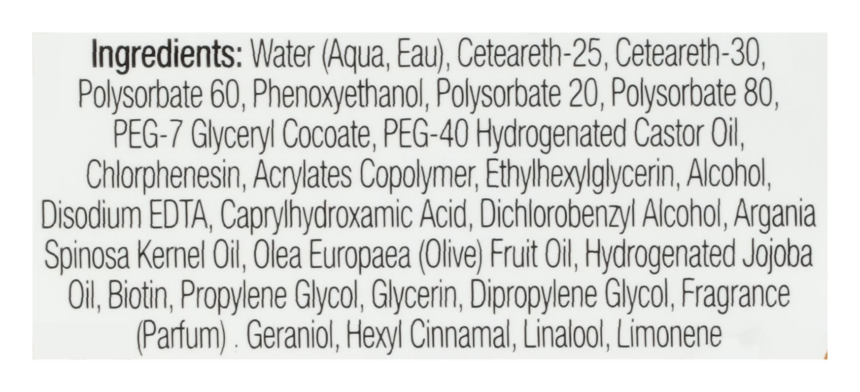 Ingredients: Water (Aqua, Eau), Ceteareth-25, Ceteareth-30, Polysorbate 60, Phenoxyethanol, Polysorbate 20, Polysorbate 80, PEG-7 Glyceryl Cocoate, PEG-40 Hydrogenated Castor Oil, Chlorphenesin, Acrylates Copolymer, Ethylhexylglycerin, Alcohol, Disodium EDTA, Caprylhydroxamic Acid, Dichlorobenzyl Alcohol, Argania Spinosa Kernel Oil, Olea Europaea (Olive) Fruit Oil, Hydrogenated Jojoba Oil, Biotin, Propylene Glycol, Glycerin, Dipropylene Glycol, Fragrance (Parfum) Geraniol, Hexyl Cinnamal, Linalool, Limonene Contains: Tree Nuts, Argan Nuts