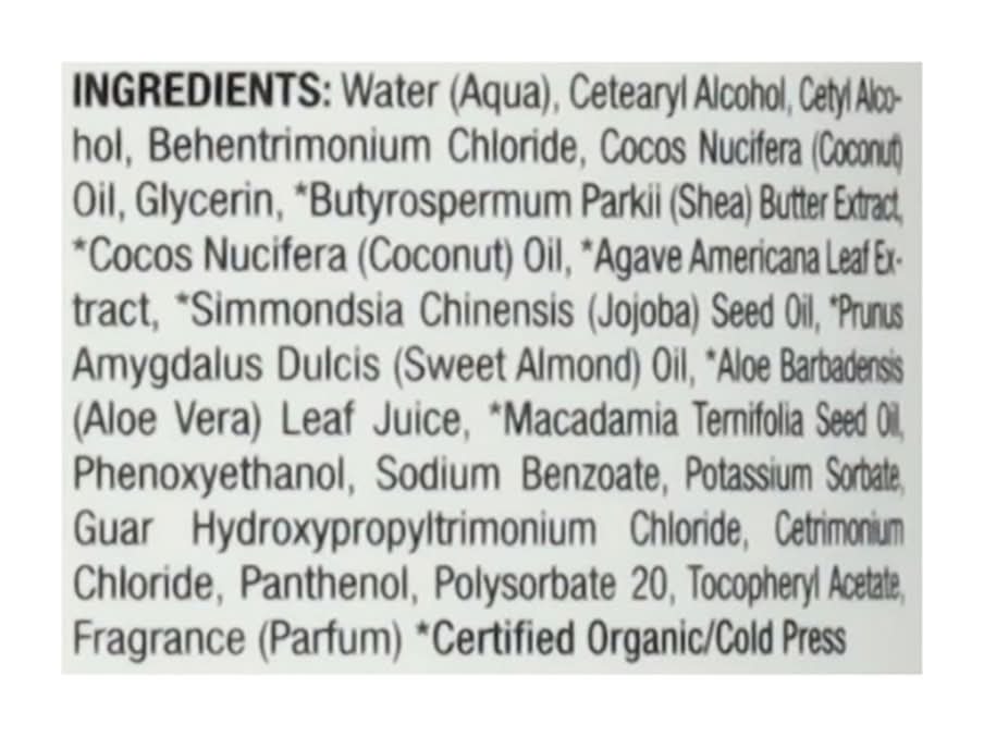 Ingredients: Water (Aqua), Cetearyl Alcohol, Cetyl Alcohol, Behentrimonium Chloride, Cocos Nucifera (Coconut) Oil, Glycerin, *Butyrospermum Parkii (Shea) Butter Extract, *Cocos Nucifera (Coconut) Oil, *Agave Americana Leaf Extract, *Simmondsia Chinensis (Jojoba) Seed Oil, *Prunus Amygdalus Dulcis (Sweet Almond) Oil, *Aloe Barbadensis (Aloe Vera) Leaf Juice, *Macadamia Ternifolia Seed Oil, Phenoxyethanol, Sodium Benzoate, Potassium Sorbate, Guar Hydroxypropyltrimonium Chloride, Cetrimonium Chloride, Panthenol, Polysorbate 20, Tocopheryl Acetate, Fragrance (Parfum). * Certified Organic/Cold Press Contains: Tree Nuts, Coconuts, Tree Nuts, Sheanuts, Tree Nuts, Almonds, Tree Nuts, Macadamia Nuts