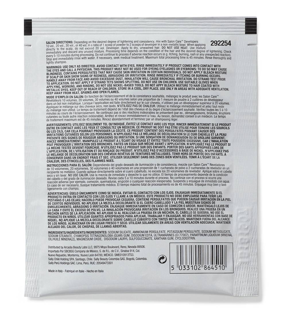 Depending on the desired degree of lightening and consistency, mix with salon care™ developers 10 vol., 20 vol., 30 vol., or 40 vol; in a ratio of 1 scoop of powder to 2 scoops of developer in a non-metallic bowl. when applying directly to the scalp, do not exceed 20 vol. developer. apply to dry, unwashed hair. do not use heat. use mixture immediately and discard any unused mixture. processing time depends on the condition of the hair and the desired degree of lightening. check every 5-10 minutes during processing. do not continue to process if adverse reaction occurs (e.g. itching, burning, rash or any unexpected reaction). stop and immediately rinse with water. if necessary, seek medical treatment. maximum total processing time is 45 minutes. rinse thoroughly and lightly shampoo.