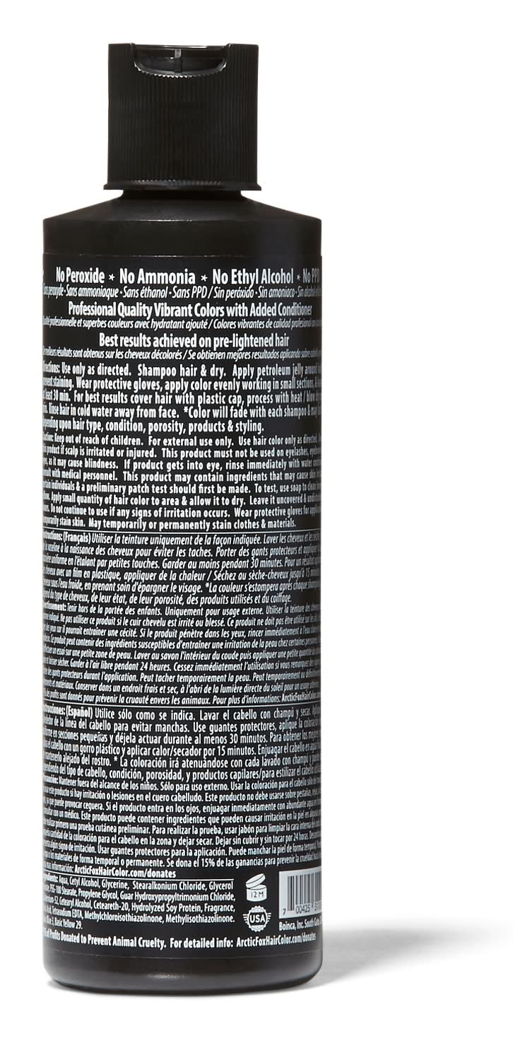 Arctic Fox color is long-lasting semi-permanent hair color that bleeds less than other semi-permanent brands, and contains added conditioners. The dye contains none of the harsh chemicals often found in other dyes, such as peroxide, ammonia, ethyl alcohol, or PPD. All Arctic Fox colors are 100% vegan and 100% cruelty-free, and 15% of all profits are donated to animal-centered charities. Arctic Fox color Purple AF was formerly known as Purple Rain. • Color: Aquamarine • Size: 8