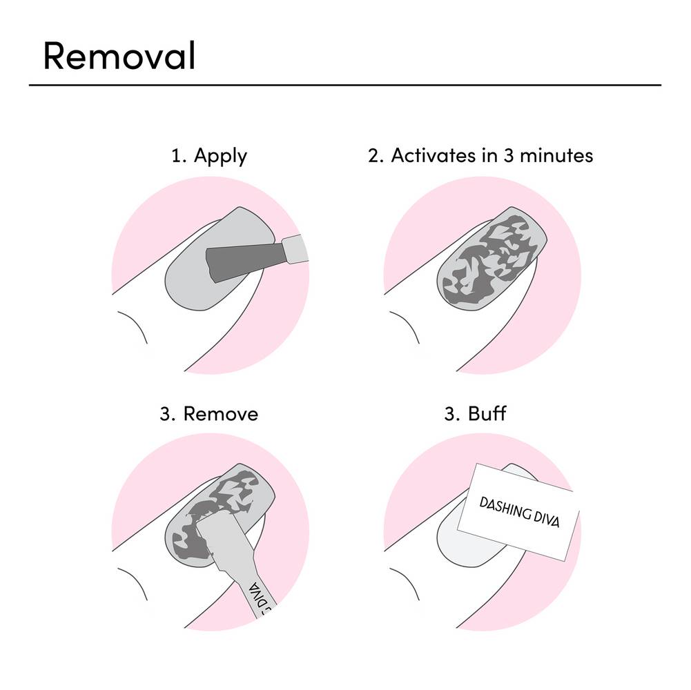 Step 1: buff buff the top layer of polish. step 2: apply remover apply a thick layer of one gel magic off on remaining gel polish, avoiding contact with skin. let product sit until gel polish starts to bubble into pieces (3 minutes). note: may feel slight tingling. if product comes in contact with skin, gently wipe off and rinse with cold water. step 3: push off gel gently scrape the gel polish off nails using a cuticle pusher. remove any small residues using the sharper side of the pusher or the included buffer. step 4: buff to finish after all gel polish is removed, lightly buff nails for a smooth, healthy nail bed.