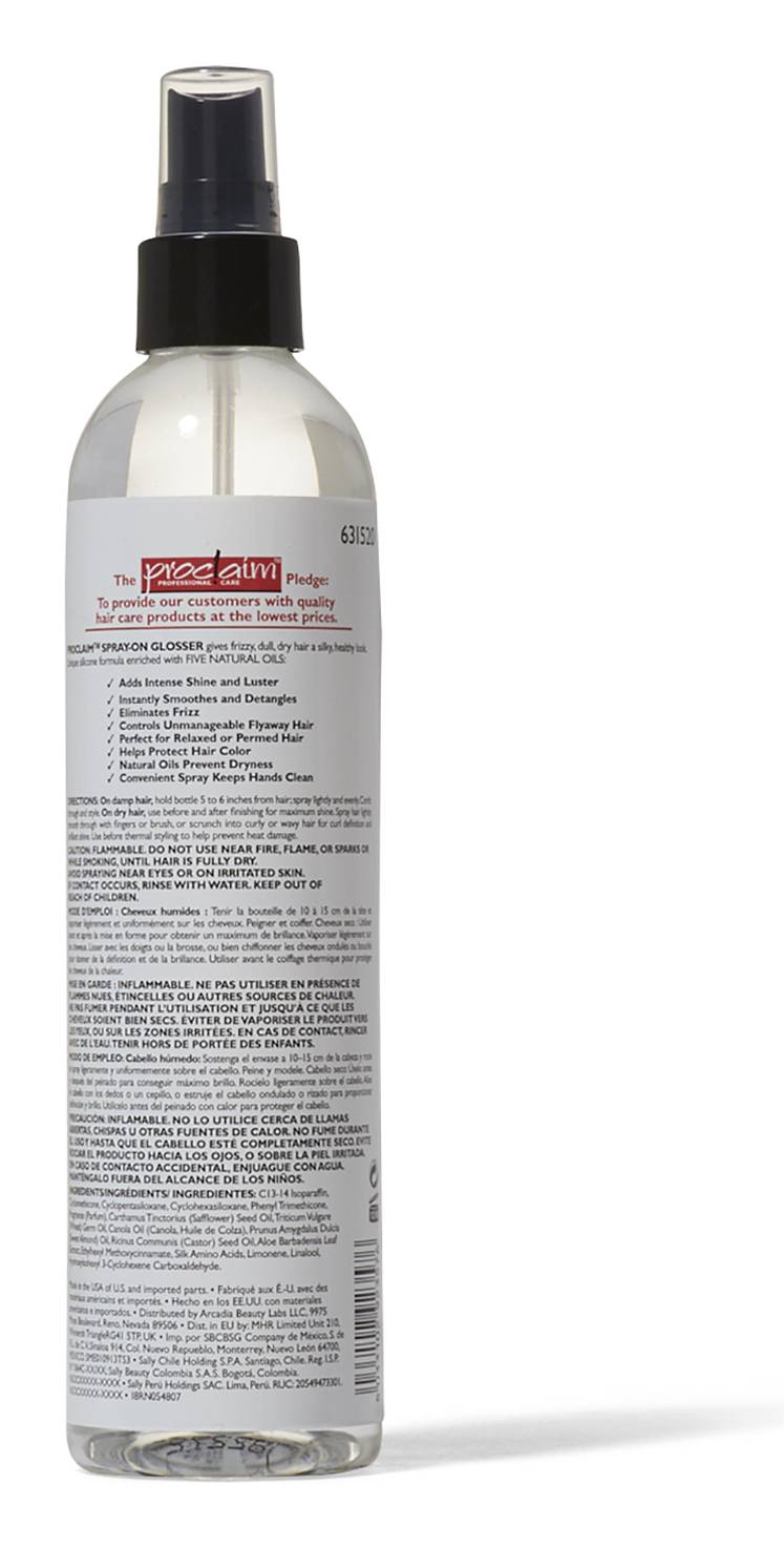 Proclaim Spray On Glosser gives frizzy, dull, dry hair a silky, healthy look. The convenient spray keeps hands clean and controls unmanageable fly-away hair as well as instantly smoothing and detangling. Also this glosser is perfect for relaxed or permed hair with the added benefit of sealing and enhancing hair color. The unique silicone formula is enriched with six natural oils adding intense shine,luster, and eliminating frizzes. Packaging: Reusable