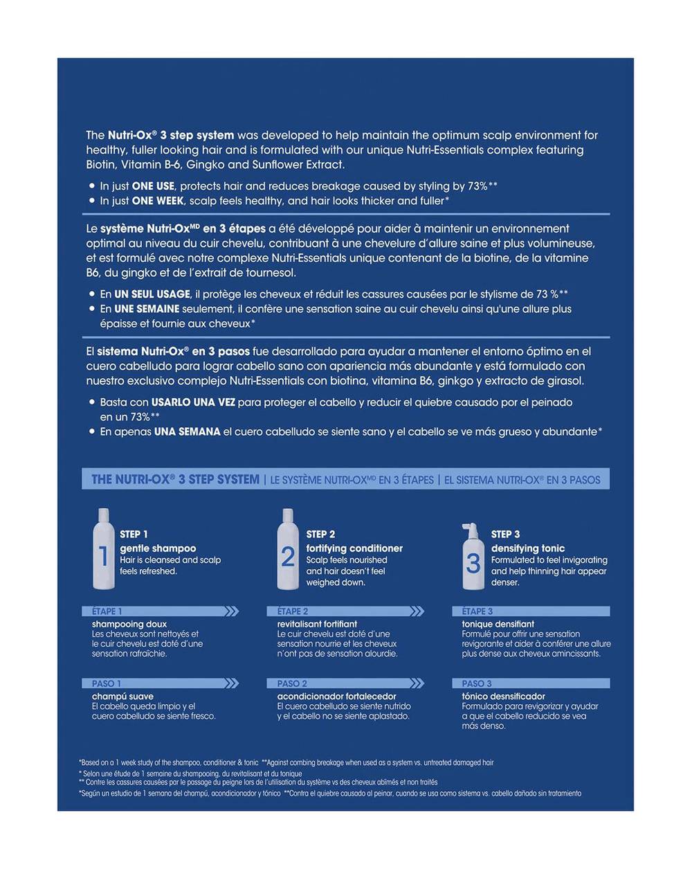 THICKER, FULLER-LOOKING HAIR IN JUST ONE WEEK* The Nutri-Ox® 3-Step System of Gentle Shampoo, Fortifying Conditioner and Densifying Tonic, for normal hair, helps maintain the optimum scalp environment for healthy-looking hair. The Nutri-Ox® Shampoo, Conditioner and Tonic work together so hair appears healthy, thicker and fuller in just 1 week*. *Based on a 1 week study of the Shampoo, Conditioner & Tonic.