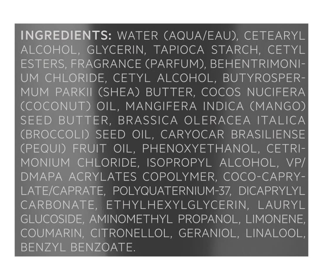 Ingredients: Water (Aqua/Eau), Cetearyl Alcohol, Glycerin, Tapioca Starch, Cetyl Esters, Fragrance (Parfum), Behentrimonium Chloride, Cetyl Alcohol, Butyrospermum Parkii (Shea) Butter, Cocos Nucifera (Coconut) Oil, Mangifera Indica (Mango) Seed Butter, Brassica Oleracea Italica (Broccoli) Seed Oil, Caryocar Brasiliense (Pequi) Fruit Oil, Phenoxyethanol, Cetrimonium Chloride, Isopropyl Alcohol, Vp/Dmapa Acrylates Copolymer, Coco Caprylate/Caprate, Polyquaternium 37, Dicaprylyl Carbonate, Ethylhexylglycerin, Lauryl Glucoside, Aminomethyl Propanol, Limonene, Coumarin, Citronellol, Geraniol, Linalool, Benzyl Benzoate Contains: Tree Nuts, Coconuts, Tree Nuts, Sheanuts