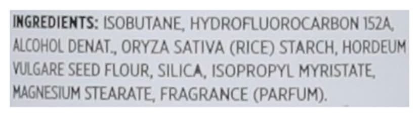 Ingredients: Isobutane, Hydrofluorocarbon 152A, Alcohol Denat, Oryza Sativa (Rice) Starch, Hordeum Vulgare Seed Flour, Silica, Isopropyl Myristate, Magnesium Stearate, Fragrance (Parfum)