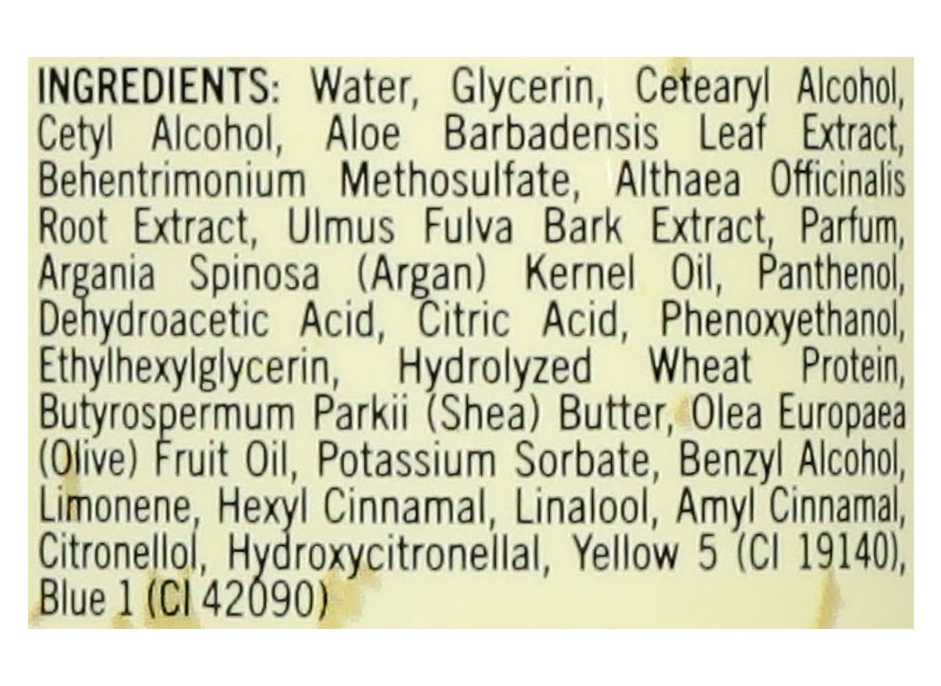 Ingredients: Water, Glycerin, Cetearyl Alcohol, Cetyl Alcohol, Aloe Barbadensis Leaf Extract, Behentrimonium Methosulfate, Althaea Officinalis Root Extract, Ulmus Fulva Bark Extract, Parfum, Argania Spinosa (Argan) Kernel Oil, Panthenol, Dehydroacetic Acid, Citric Acid, Phenoxyethanol, Ethylhexylglycerin, Hydrolyzed Wheat Protein, Butyrospermum Parkii (Shea) Butter, Olea Europaea (Olive) Fruit Oil, Potassium Sorbate, Benzyl Alcohol, Limonene, Hexyl Cinnamal, Linalool, Amyl Cinnamal, Butylphenyl Methylpropional, Citronellol, Hydroxycitronellal, Yellow 5 (CI 19140), Blue 1 (CI 42090) Contains: Tree Nuts, Argan Nuts, Wheat, Tree Nuts, Sheanuts