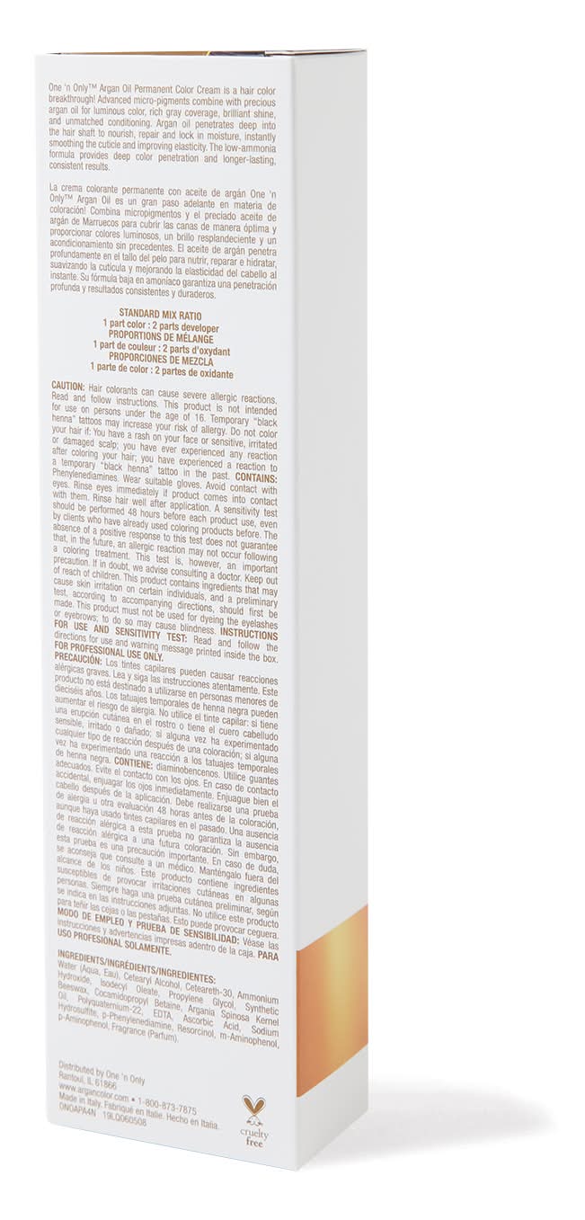 One ‘n Only Argan Oil Permanent Color cream is a hair color breakthrough! Advanced micro pigments combine with precious argan oil for luminous color, rich gray coverage, brilliant shine, and unmatched conditioning. Argan oil penetrates deep into the hair shaft to nourish, repair and lock in moisture, instantly smoothing the cuticle and improving elasticity. The low-ammonia formula provides deep color penetration and longer-lasting, consistent results. • Color: 4n medium natural brown • Size: 3 • One n' Only, Rantoul, IL 61866