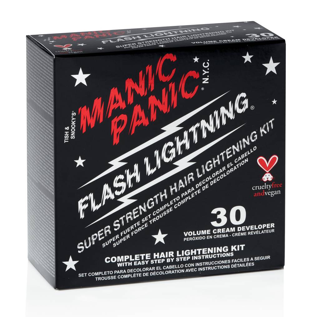Manic Panic Flash Lightning Bleach Kit is designed for pre-lightening the hair before application of the Manic Panic semi-permanent hair colors. Everything you need to lighten your hair is included in this kit: Dust-free bleach powder, cream developer, mixing tub, tint brush, plastic cap, protective gloves and instructions.