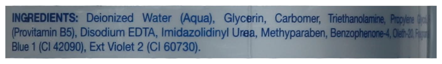 Ingredients: Deionized Water (Aqua), Glycerin, Carbomer, Triethanolamine, Propylene Glycol, Panthenol (Provitamin B5), Disodium EDTA, Imidazolidinyl Urea, Methyparaben, Benzophenone-4, Oleth-20, Fragrance (Parfum), Blue 1 (CI 42090), Ext Violet 2 (CI 60730)