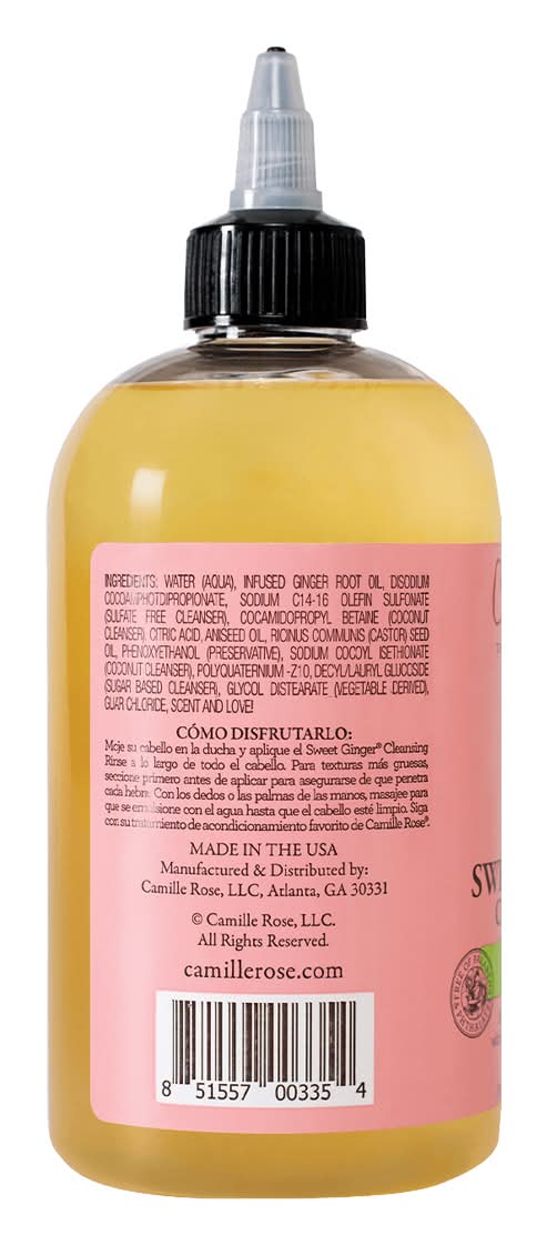 How to enjoy: drench strands in the shower and apply sweet ginger cleansing rinse throughout the length of hair. for thicker textures, section first before applying to ensure every strand is penetrated. using fingers or palms, massage to emulsify with water until hair is clean. follow with your favorite camille rose conditioning treatment. - directions: how to enjoy: drench strands in the shower and apply sweet ginger cleansing rinse throughout the length of hair. for thicker textures, section first before applying to ensure every strand is penetrated. using fingers or palms, massage to emulsify with water until hair is clean. follow with your favorite camille rose conditioning treatment.