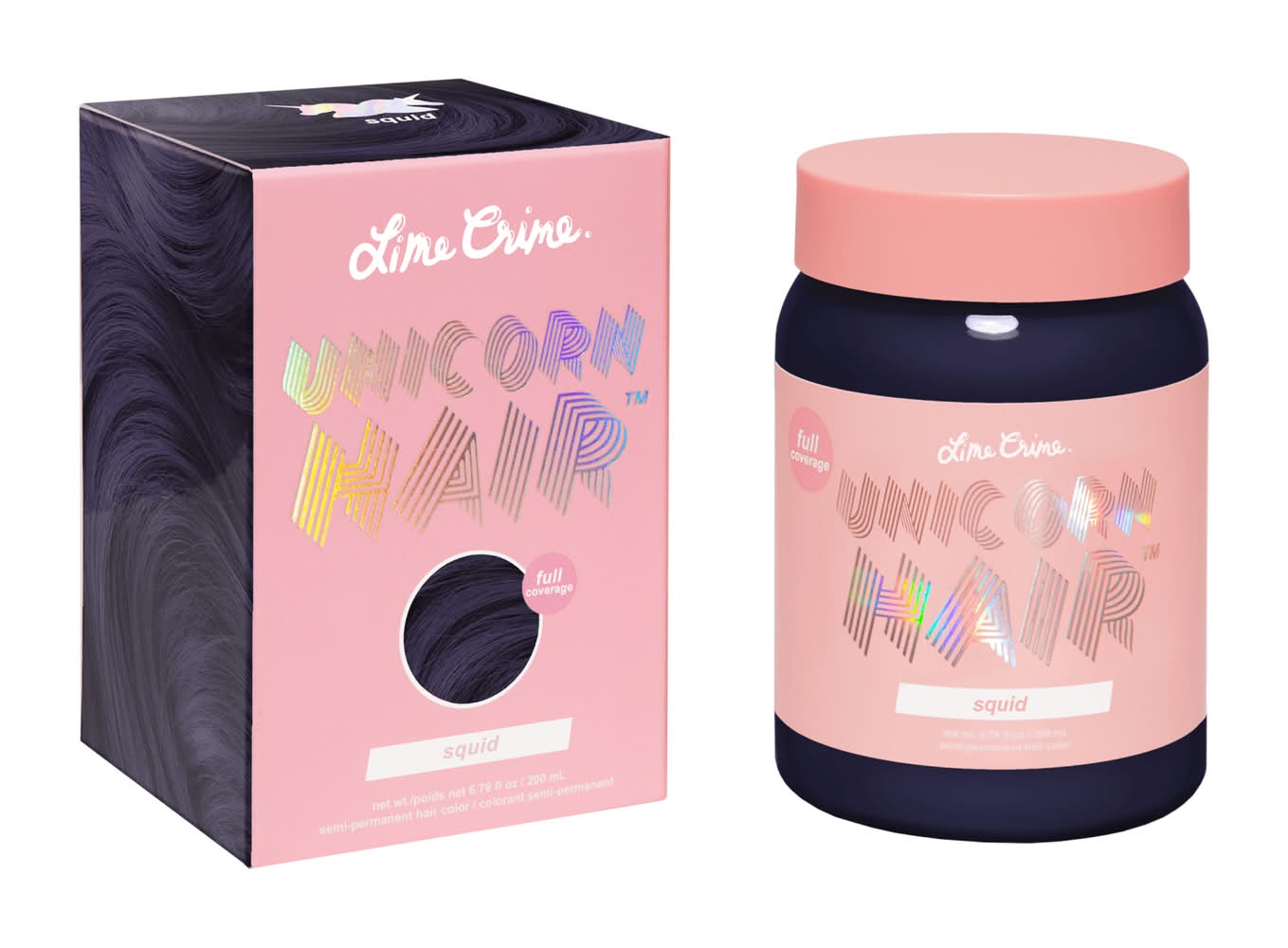 Dyed and gone to Unicorn Heaven! Lime Crime Unicorn Hair Full Coverage ultra-conditioning formula delivers high intensity, magical color results. Vibrant, bold and darker shades are in the full coverage range. DIY-friendly, damage-free color works gently, washes out gradually and fades gracefully. Works best with pre-bleached platinum to medium blonde hair and adds a tint of color to dark blonde and light brown hair. Unicorn Hair is 100% Vegan & Cruelty-Free. • Color: Squid • Size: 6.76
