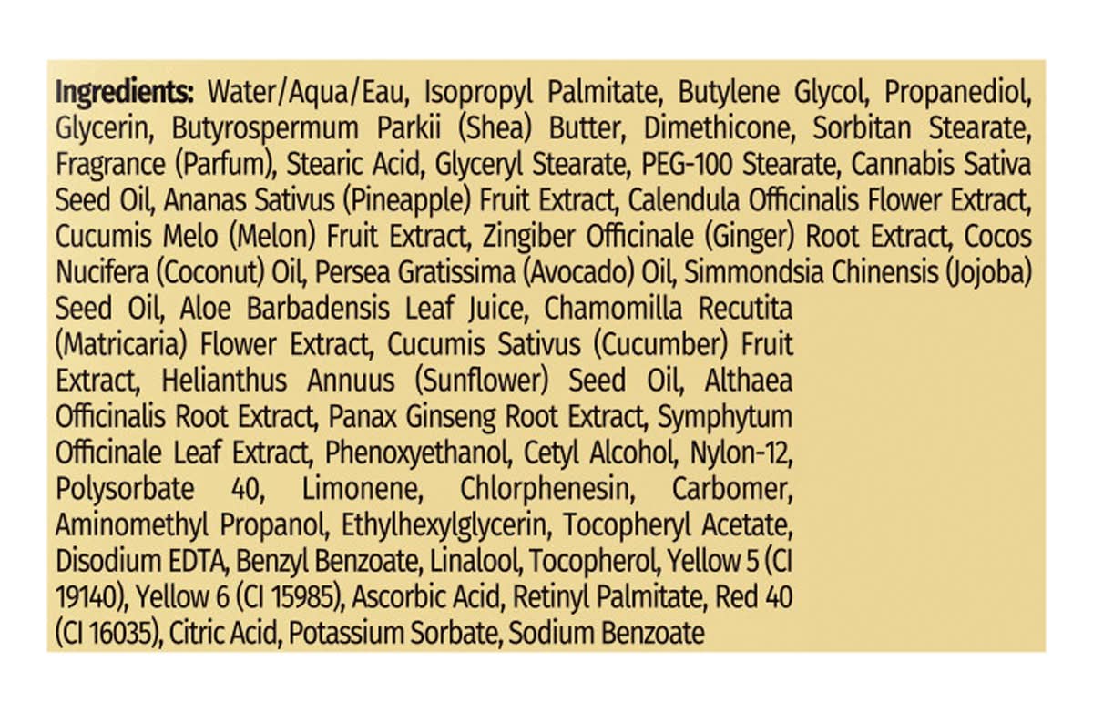 Ingredients: Water/Aqua/Eau, Isopropyl Palmitate, Butylene Glycol, Propanediol, Glycerin, Butyrospermum Parkii (Shea) Butter, Dimethicone, Sorbitan Stearate, Fragrance (Parfum), Stearic Acid, Glyceryl Stearate, PEG-100 Stearate, Cannabis Sativa Seed Oil, Ananas Sativus (Pineapple) Fruit Extract, Calendula Officinalis Flower Extract, Cucumis Melo (Melon) Fruit Extract, Zingiber Officinale (Ginger) Root Extract, Cocos Nucifera (Coconut) Oil, Persea Gratissima (Avocado) Oil, Simmondsia Chinensis (Jojoba) Seed Oil, Aloe Barbadensis Leaf Juice, Chamomilla Recutita (Matricaria) Flower Extract, Cucumis Sativus (Cucumber) Fruit Extract, Helianthus Annuus (Sunflower) Seed Oil, Althaea Officinalis Root Extract, Panax Ginseng Root Extract, Symphytum Officinale Leaf Extract, Phenoxyethanol, Cetyl Alcohol, Nylon-12, Polysorbate 40, Limonene, Chlorphenesin, Carbomer, Aminomethyl Propanol, Ethylhexylglycerin, Tocopheryl Acetate, Disodium EDTA, Benzyl Benzoate, Linalool, Tocopherol, Yellow 5 (CI 19140), Yellow 6 (CI 15985), Ascorbic Acid, Retinyl Palmitate, Red 40 (CI 16035), Citric Acid, Potassium Sorbate, Sodium Benzoate Contains: Tree Nuts, Sheanuts, Tree Nuts, Coconuts