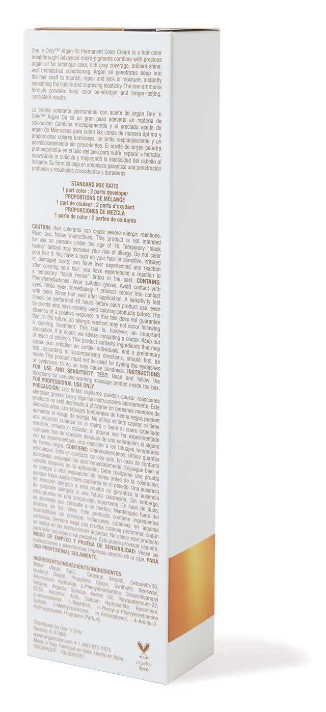 One ‘n Only Argan Oil Permanent Color cream is a hair color breakthrough Advanced micro pignment combine with precious argan oil for luminous color, rich gray coverage, brilliant shine, and unmatched conditioning. Argan oil penetrates deep into the hair shaft to nourish, repair and lock in moisture, instantly smoothing the cuticle and improving elasticity. The low-ammonia formula provides deep color penetration and longer-lasting, consistent results. • Color: 3cp dark cappuccino brown • Size: 3