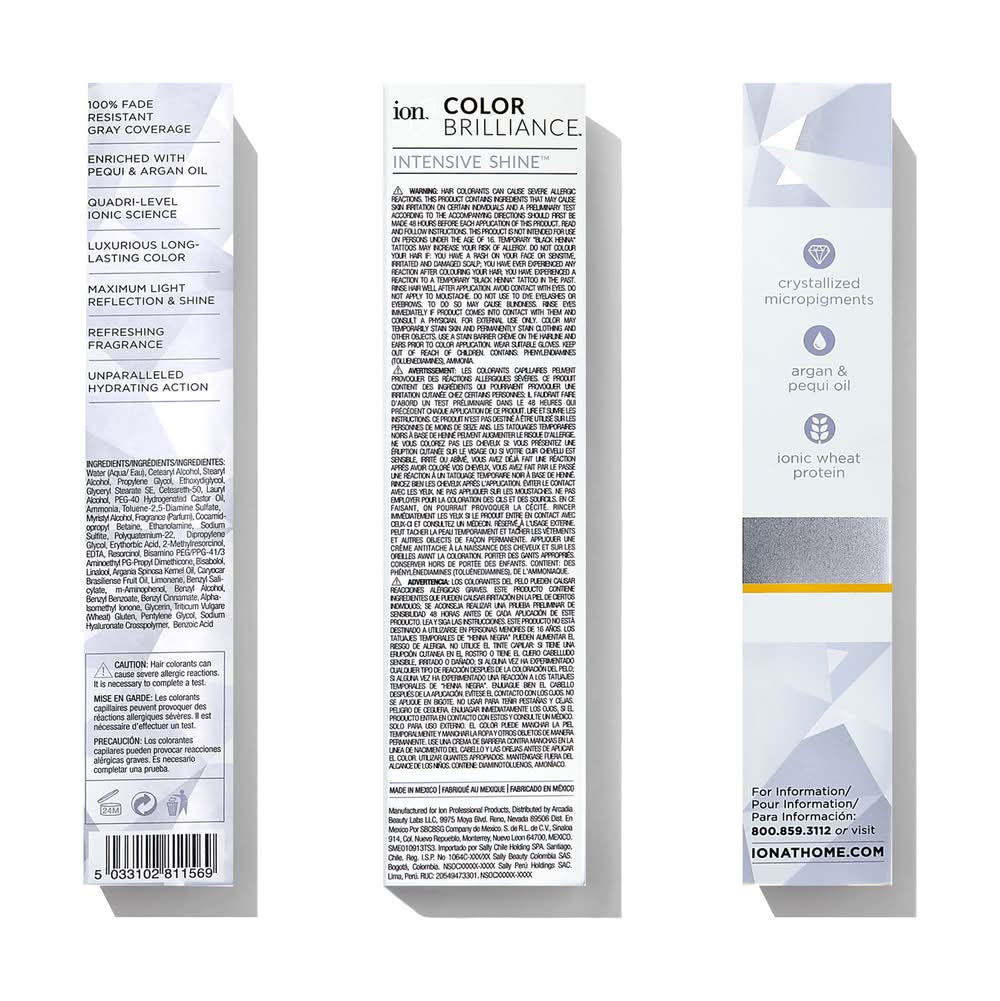 The advanced ionic technology utilizes pure ionic micro pigments for deeper, more intense color deposit. ion Color Brilliance penetrates the cuticle layer of the hair and lodges in the cortex, ensuring 100% flawless gray coverage. High Lift shades lift up to 5 levels and tone without bleach. ion Hair Color’s superior quality, proprietary blends are formulated in Italy by our expert team of chemists to deliver unparalleled results. ion's unique system combines the finest quality natural and exotic ingredients with powerful high-tech compounds to achieve exquisite, brilliant color with superior gray coverage. ion Hair Color science relies on the power of micro-pigmentation — ion's microscopic pigment molecules oxidize slower, allowing them to penetrate deep into the cortex of each hair strand for long-lasting, fade-resistant color. These formulas are PPD free and enriched with hyaluronic acid, argan oil, pequi oil and botanicals to nourish and strengthen hair from within. Not to mention, ion Hair Color is gentle on hair, containing up to 38% less ammonia than the leading professional brands on the market. • Color: 7nn medium intense blonde • Size: 2.05 • Packaging: Reusable