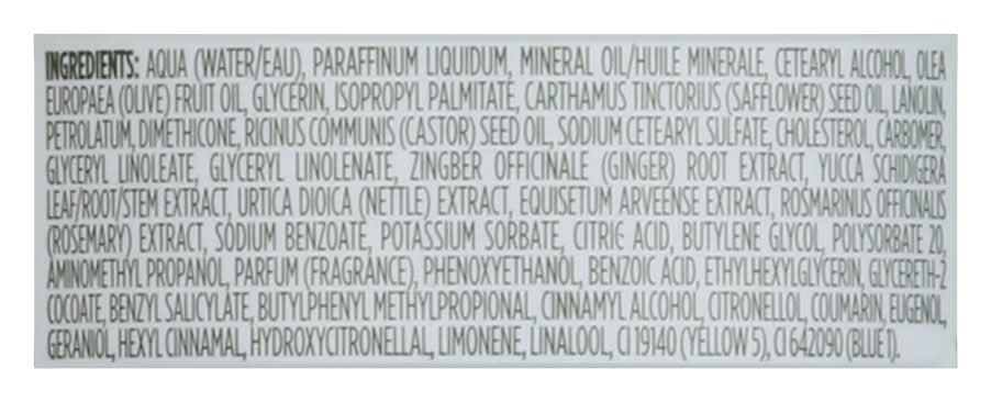 Ingredients: Aqua (Water/Eau), Paraffinum Liquidum, Mineral Oil, Cetearyl Alcohol, Olea Europaea (Olive) Fruit Oil, Glycerin, Isopropyl Palmitate, Carthamus Tinctorius (Safflower) Seed Oil, Lanolin, Petrolatum, Dimethicone, Ricinus Communis (Castor) Seed Oil, Sodium Cetearyl Sulfate, Cholesterol, Carbomer, Glyceryl Linoleate, Glyceryl Linolenate, Zingber Officinale (Ginger) Root Extract, Yucca Schdigera Leaf/Root/Stem Extract, Urtica Dioica (Nettle) Extract, Equisetum Arveense Extract, Rosmarinus Officinalis (Rosemary) Extract, Sodium Benzoate, Potassium Sorbate, Citric Acid, Butylene Glycol, Polysorbate 20, Aminomethyl Propanol, Parfum (Fragrance), Phenoxyethanol, Benzoic Acid, Ethylhexylglycerin, Glycereth-2 Cocoate, Benzyl Salicylate, Butylphenyl Methylpropional, cinnamyl Alcohol, Citronellol, Coumarin, Eugenol, Geraniol, Hexyl Cinnamal, Hydroxycitronellal, Limonene, Linalool, CI 19140 (Yellow 5), CI 642090 (Blue1)