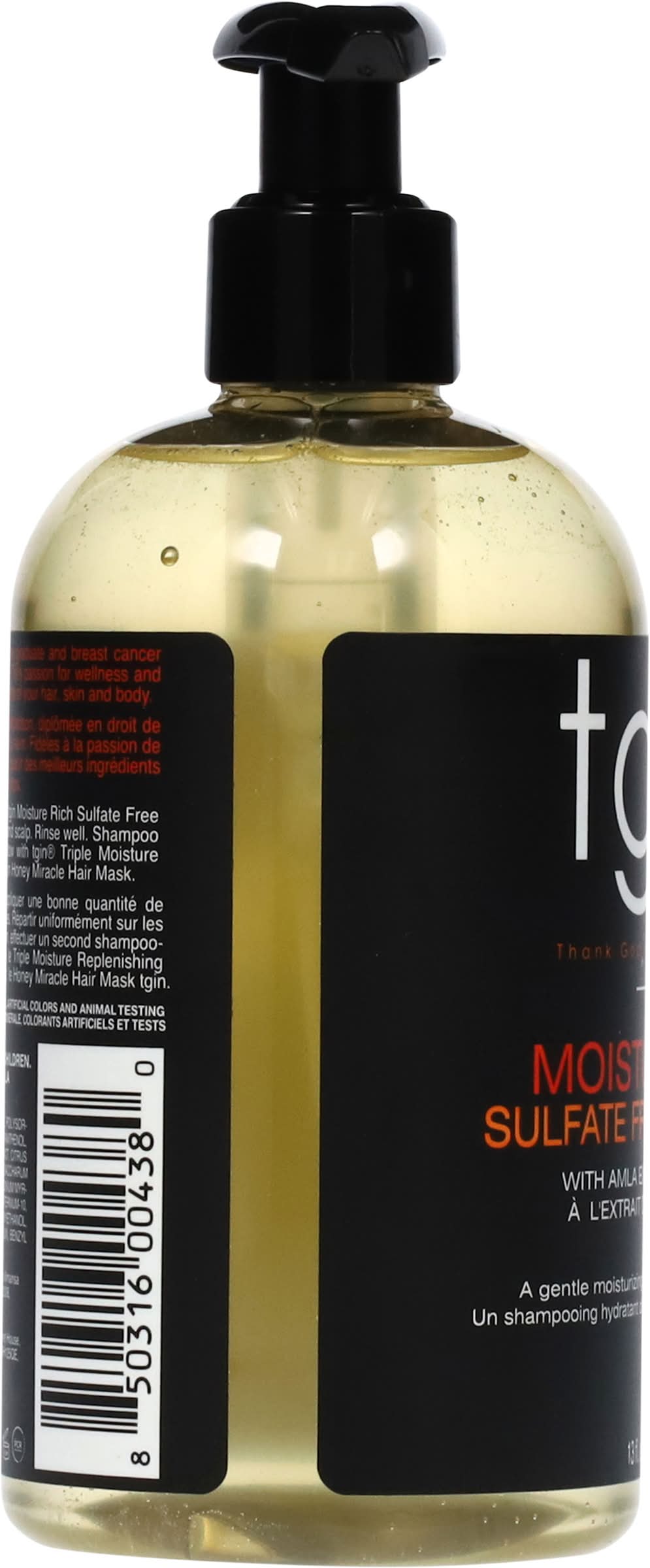 Wet hair thoroughly. apply a liberal amount of tgin moisture rich sulfate free shampoo to your palms. distribute evenly throughout hair and scalp. rinse well. shampoo a second time if needed to remove excess buildup. follow with tgin triple moisture replenishing conditioner or for extra deep conditioning, tgin honey miracle hair mask.