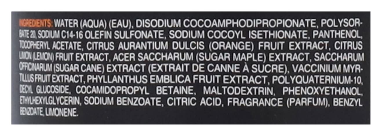 Ingredients: Water (Aqua) (Eau), Disodium Cocoamphodipropionate, Polysorbate 20, Sodium C14-16 Olefin Sulfonate, Sodium Cocoyl Isethionate, Panthenol, Tocopheryl Acetate, Citrus Aurantium Dulcis (Orange) Fruit Extract, Citrus Limon (Lemon) Fruit Extract, Acer Saccharum (Sugar Maple) Extract, Saccharum Officinarum (Sugar Cane) Extract (Extrait De Canne À Sucre), Vaccinium Myrtillus Fruit Extract, Phyllanthus Emblica Fruit Extract, Polyquaternium-10, Decyl Glucoside, Cocamidopropyl Betaine, Maltodextrin, Phenoxyethanol Ethylhexylglycerin, Sodium Benzoate, Citric Acid, Fragrance (Parfum), Benzyl Benzoate, Limonene Contains: Tree Nuts
