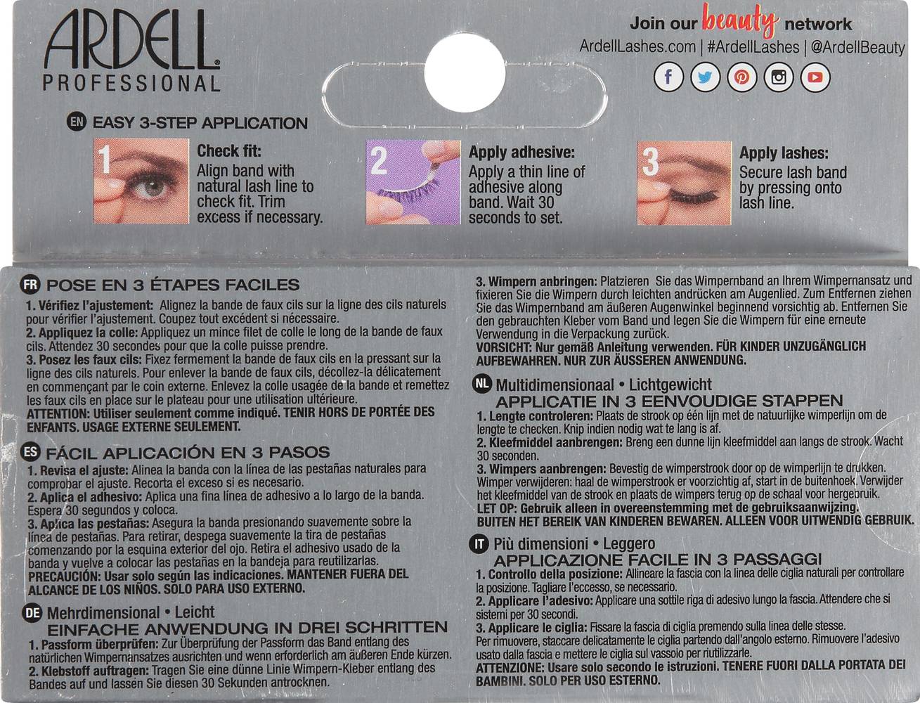 Multi-Dimensional. Lightweight. Invisiband. Contains 1 pair of lashes. ArdellLashes.com. Join our beauty network. (hashtag)ArdellLashes. (at)ArdellBeauty. Facebook. Twitter. Pinterest. Instagram. YouTube. Please recycle packaging. Made in China.