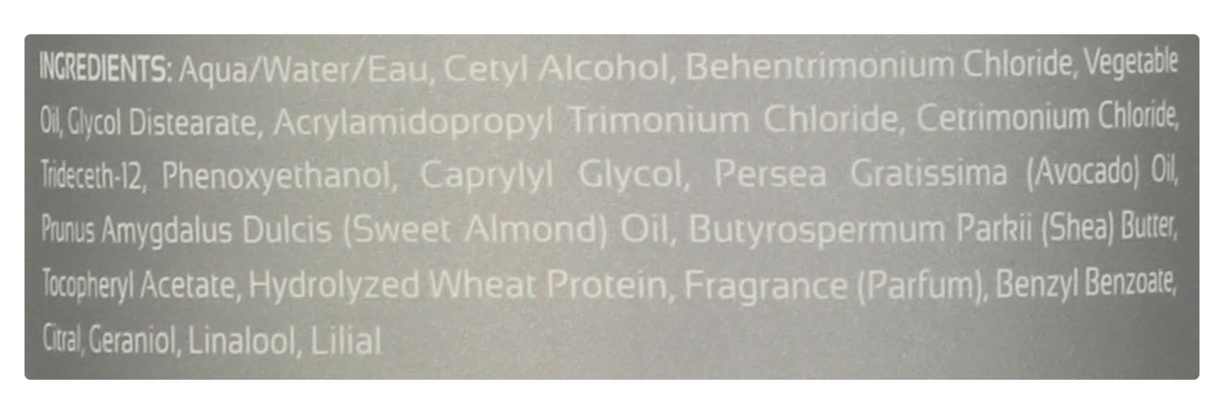 Ingredients: Aqua/Water/Eau, Cetyl Alcohol, Behentrimonium Chloride, Vegetable Oil, Glycol Distearate, Acrylamidopropyl Trimonium Chloride, Cetrimonium Chloride, Tridiceth-12, Phenoxyethanol, Caprylyl Glycrol, Persea Gratissima (Avocado) Oil, Prunus Amygdalus Dulcis (Sweet Almond) Oil, Butyrospermum Parkii (Shea) Butter, Tocopheryl Acetate, Hydrolyzed Wheat Protein, Fragrance (Parfum), Benzyl Benzoate, Citral, Geraniol, Linalool, Lilial Contains: Tree Nuts, Wheat