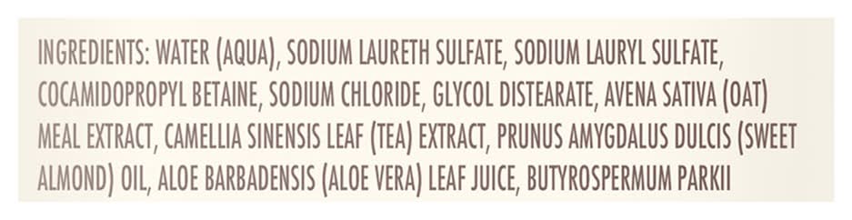 Ingredients: Water (Aqua), Sodium Laureth Sulfate, Sodium Lauryl Sulfate, Cocamidopropyl Betaine, Sodium Chloride, Glycol Distearate, Avena Sativa (Oat) Meal Extract, Camellia Sinensis Leaf (Tea) Extract, Prunus Amygdalus Dulcis (Sweet Almond) Oil, Aloe Barbadensis (Aloe Vera) Leaf Juice, Butyrospermum Parkii Contains: Oat, Tree Nuts, Almonds