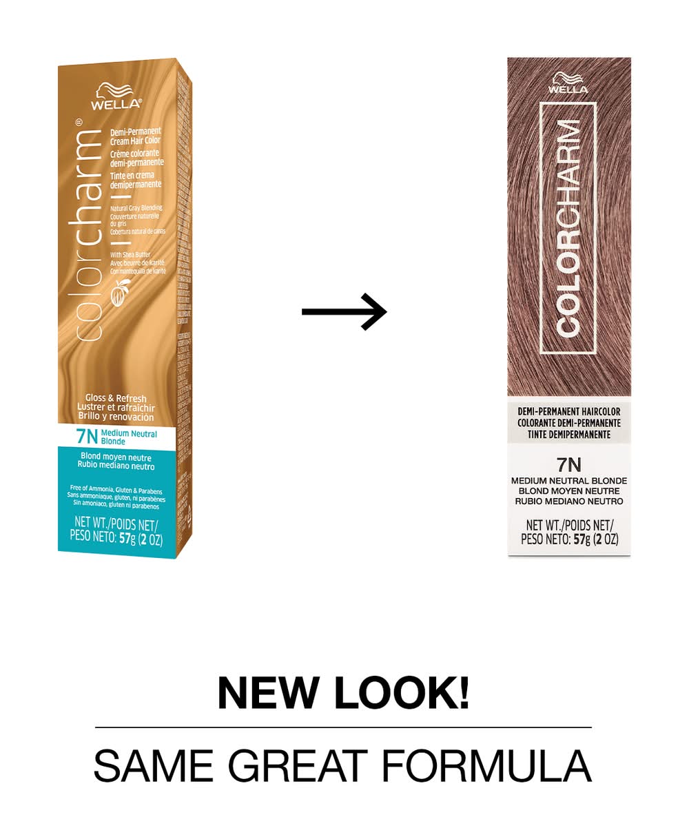 Be a boss in gloss. Nothing boosts confidence like finding that perfect shade and stepping out with rich, glossy hair. New Wela color charm Demi-Permanent Color offers shiny, healthy looking color with less damage. Featuring Shea Butter, our formula is gentler on all hair textures and free of animal derived ingredients, ammonia, gluten, parabens, and phthalates. Safe, quick, and easy to apply, Wela color charm Demi-Permanent Color is perfect for in-between salon visits. Now you can blend grays, gloss, tone, refresh, or enhance your color on your own terms. Results last up to 24 washes. With our new color-coded packaging for at-a-glance navigation and selection, finding your ideal shade has never been easier. From vibrant, commanding reds and violets to flawlessly toned blondes and gorgeous brunettes, we’ve got your perfect shade. Love your current color but want to make it shine? Our Clear shade adds eye-catching gloss to any color. We give you the color to be a boss in gloss. Create With Confidence. vs. permanent color depending on your hair type • Color: 7n medium neutral blonde • Size: 2