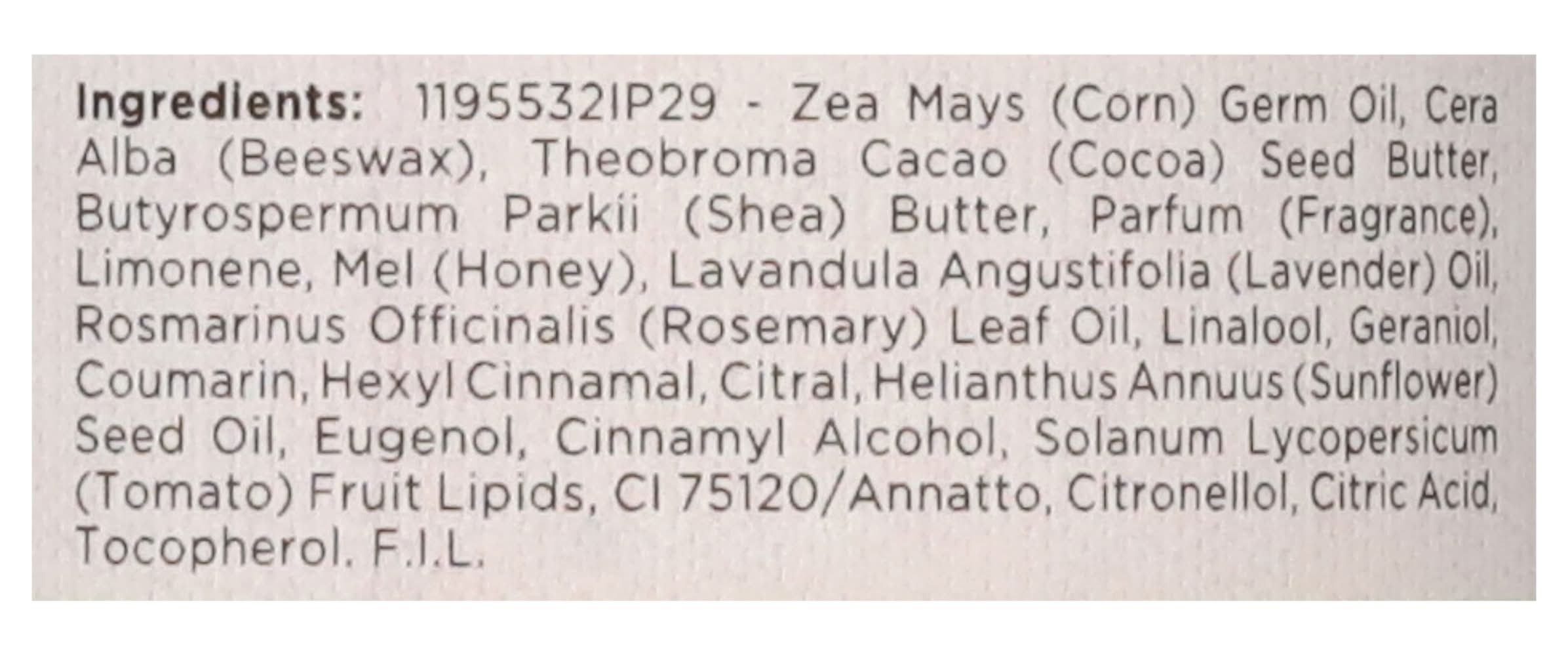 Ingredients: 11955321p29 Zea Mays (Corn) Germ Oil, Cera Alba (Beeswax), Theobroma Cacao (Cocoa) Seed Butter, Butyrospermum Parkii (Shea) Butter, Parfum (Fragrance), Limonene, Mel (Honey), Lavandula Angustifolia (Lavender) Oil, Rosmarinus Officinalis (Rosemary) Leaf Oil, Linalool, Geraniol, Coumarin, Hexyl Cinnamal, Citral, Helianthus Annuus (Sunflower) Seed Oil, Eugenol, Cinnamyl Alcohol, Solanum Lycopersicum (Tomato) Fruit Lipids, CI 75120/Annatto, Citronellol, Citric Acid, Tocopherol, F, J, L, D264618/2 Contains: Corn, Tree Nuts, Sheanuts