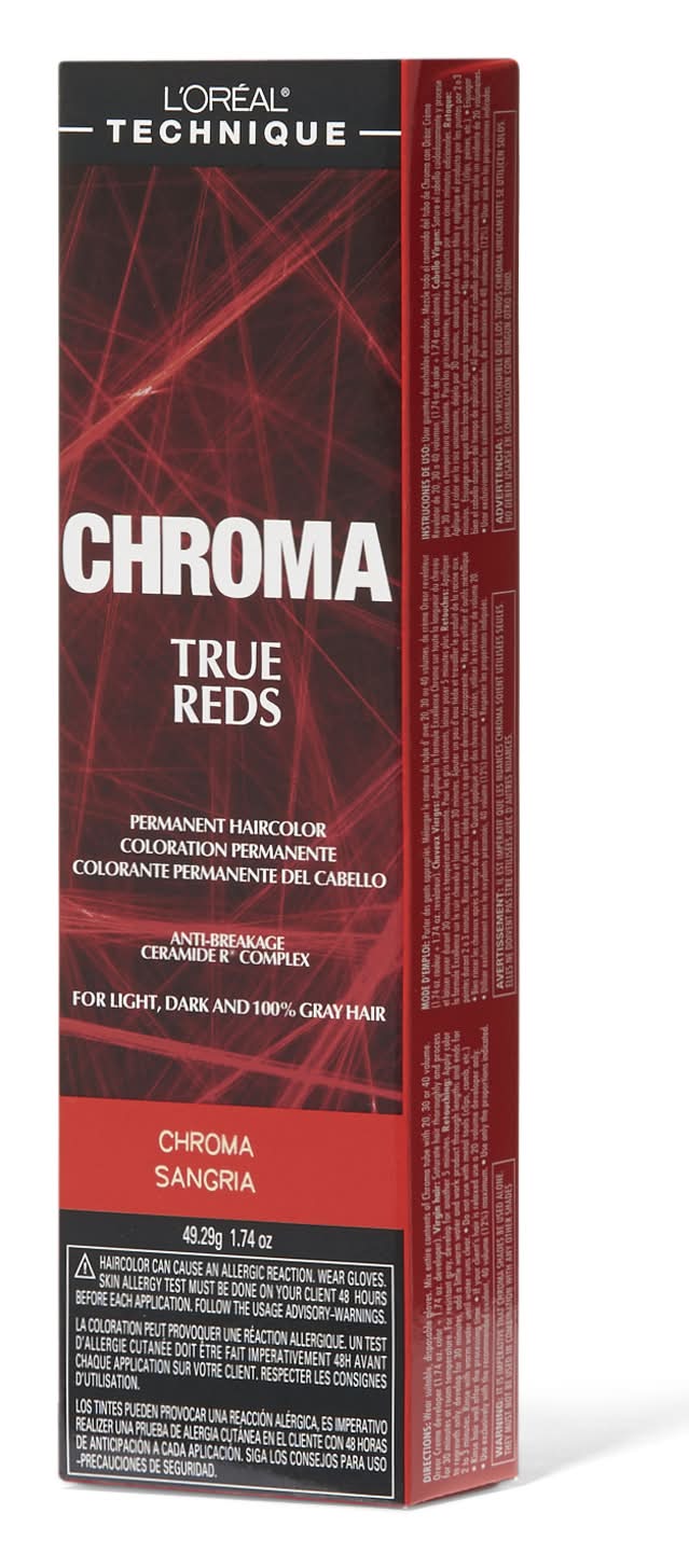 L'Oreal Technique CHROMA True Reds collection utilizes a unique red dye technology for L'Oreal Technique that delivers key benefits to customers looking for beautiful red hair color. This permanent hair color has been formulated with Anti-Breakage Ceramide R Complex which penetrates the hair's cortex to condition and help protect against breakage. CHROMA True Reds are long-lasting. After repeated shampooing, color stays deep and true without shifting tone. CHROMA True Reds features unique red hues for L'Oreal Technique; high intensity deep garnet and deep red color shades. They are suitable for use on all bases of hair, light, dark and 100% gray delivering identifiable red color results on all natural levels of hair. In addition, True Reds provides excellent gray coverage with deep color and highlights on high percentages of gray hair • Color: Chroma sangria • Size: 1.74
