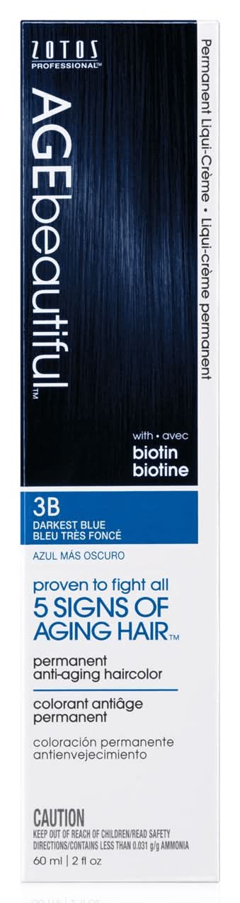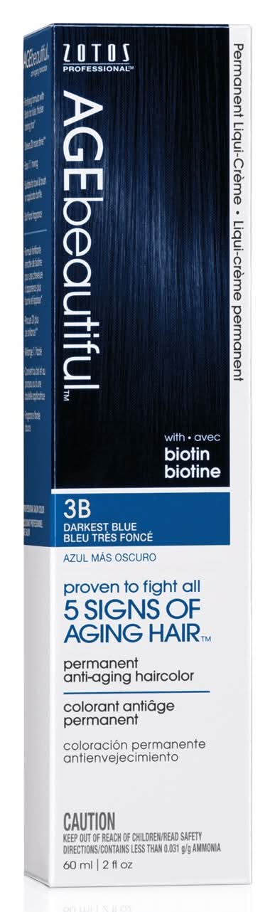 As we age, our hair experiences five signs of aging. It loses volume, manageability, color, moisture and shine. AGEbeautiful Anti-Aging Permanent Liqui-Creme Hair Color, now with Biotin, is the first permanent liqui-creme color developed to fight all five signs of aging hair. AGEbeautiful is our professional hair color formula with Biotin, melanin, keratin peptide, silk protein and a patented conditioning technology to replenish hair with the essential components that are lost with aging. The unique formula penetrates deeply and absorbs quickly to cover gray 100% and deliver beautiful, rich color that lasts for up to 8 weeks. AGEbeautiful Permanent Liqui-Creme Hair Color helps to nourish and fortify the fibers for fuller, thicker and healthier looking hair*. Hair will instantly feel softer and more manageable. Delivers 2X more shine**. *when used as directed **versus untreated hair ZOTOS PROFESSIONAL CONTACT INFORMATION Our Zotos Professional Stylists are currently available to answer product and technical questions as well as provide personal hair recommendations for our hair color, hair care, styling and perm collections. CALL OR TEXT US: 1-800-242-9283 9:00am – 8:00pm ET Monday through Friday LIVE CHAT US: visit zotosprofessional.com 9:00am – 8:00pm ET Monday through Saturday 12:00pm – 5:00 pm ET Sunday EMAIL US: visit zotosprofessional.com • Pack size: 2 • Color: 3b darkest blue • Size: 2
