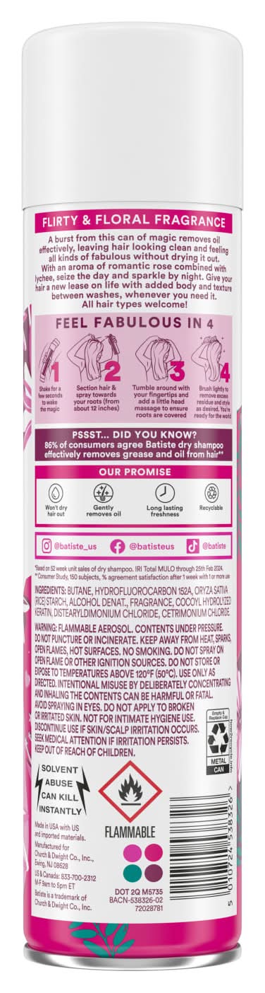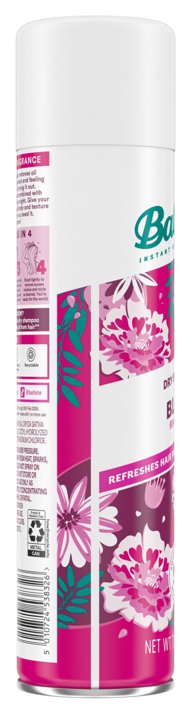 Take your hair from flat to fab with Batiste Blush Dry Shampoo. Our waterless formula targets excess oil and grease at the roots. Batiste Blush locks in flirty, feminine scents of lily, peony, and freesia that never overpower. Just spray in, massage, style, and go. Batiste Dry Shampoo instantly makes your hair feel clean, fresh, with added body and texture. Perfect for the girl-on-the-go, use Batiste Dry Shampoo between washes to keep your hair looking fresh and fabulous without the effort. Let's face it, life gets crazy sometimes and skipping a wash (or two) is inevitable. With Batiste Dry Shampoo, you can be confident your hair looks great no matter what life throws your way.