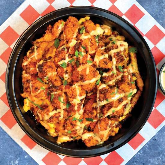 Mac n cheese topped with chick sauce, chopped Nashville tenders, slaw & pickles, and more sauce.